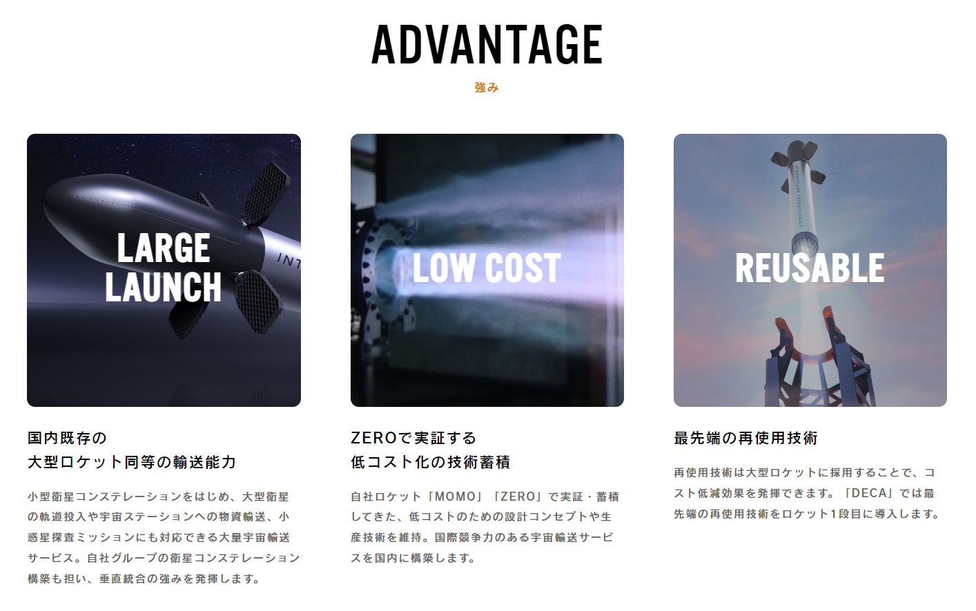 インターステラテクノロジズのロケットはMOMO、ZEROともに、設計上の工夫や生産技術の革新により抜本的な低コスト化を図っており、DECAでもそのコンセプトを継承します。また、ZEROのような小型ロケットではコストメリットが小さかった再使用技術を大型化に伴って新たに採用、従来より一桁安い価格で、国際競争力のある宇宙輸送サービスを国内に構築していきます。