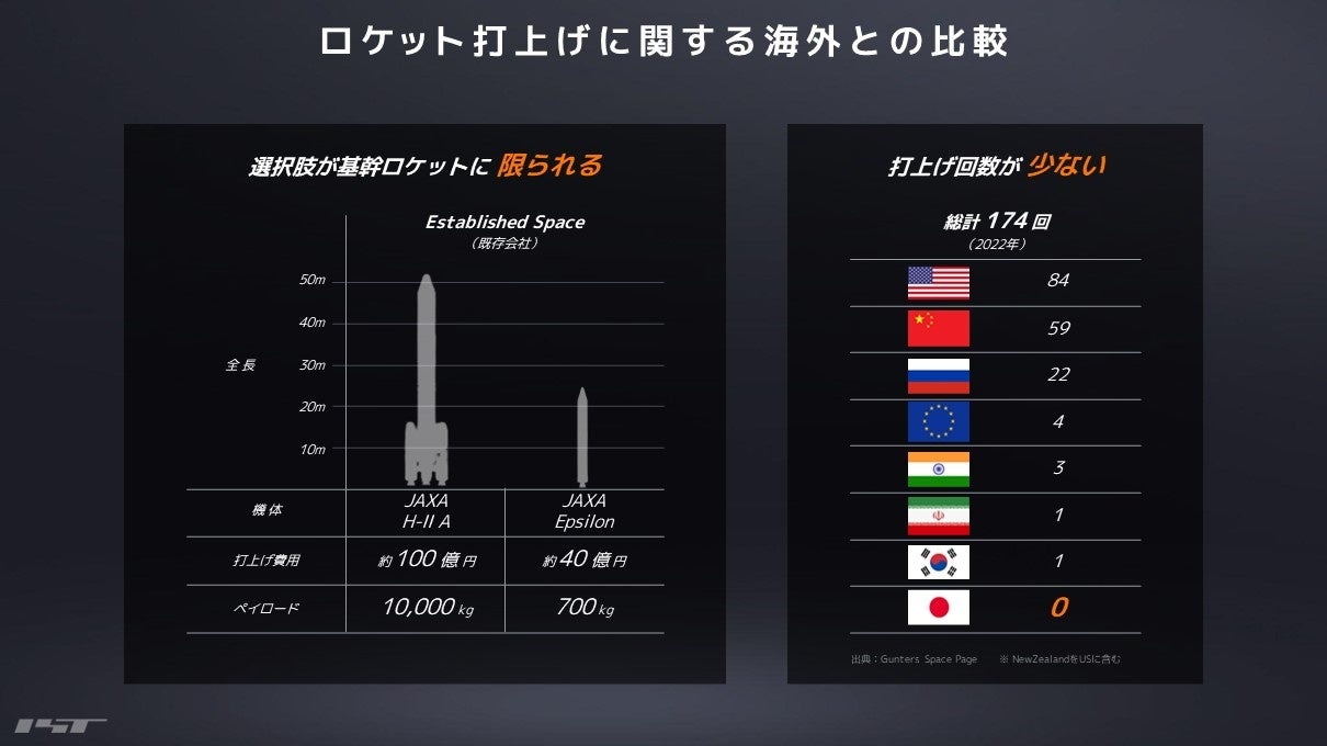 ロケットは衛星を運ぶための唯一の手段であり、アメリカや中国を中心に世界の打上げ回数は年々、飛躍的に増えています。一方、2022年の日本の打上げ回数は世界全体174回に対して0回となり(下図参照)、国内の衛星打上げ需要の多くが海外に流出しています。さらに、ウクライナ戦争の影響で、世界の宇宙輸送の約1割を占めているロシアのロケットを日本や欧米諸国は使えなくなり、経済安全保障の観点からも国内への宇宙輸送能力の増強が求められています。