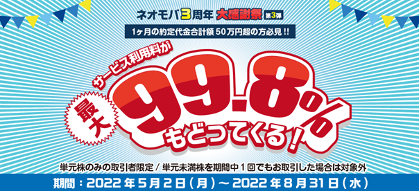 株式会社SBIネオモバイル証券(本社:東京都港区、代表取締役社長:小川裕之、以下「当社」)は、2022年5月2日(月)から8月31日(水)まで、「サービス利用料が最大99.8%もどってくる!キャンペーン」を実施します。