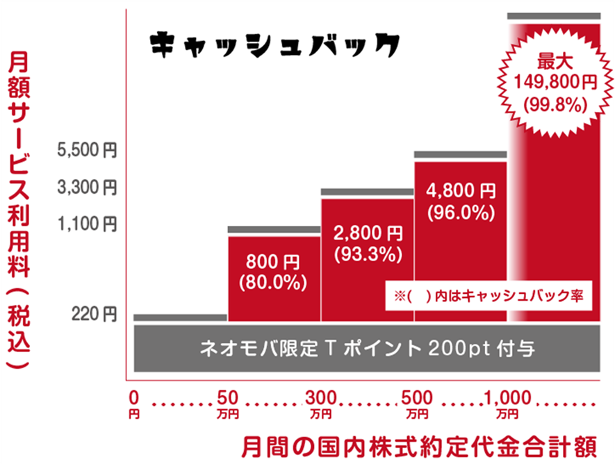 1ヵ月の約定代金合計額が50万円超の場合、サービス利用料が最大で99.8%もどってきます。