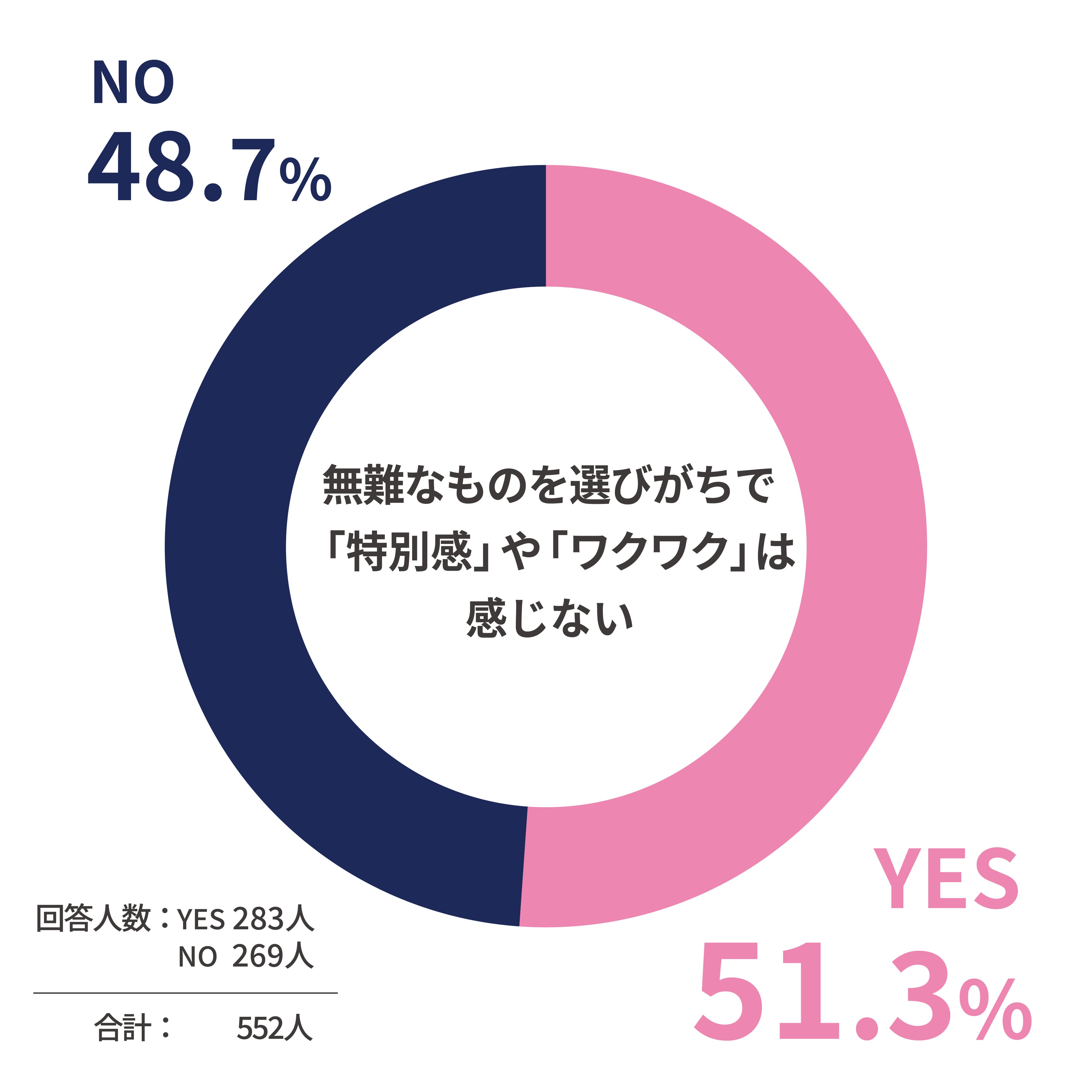 「無難なものを選びがちで「特別感」や「ワクワク」は感じない?」という問いに対しては「YES」が51%、「NO」が49%とほぼ半々の結果となりました。