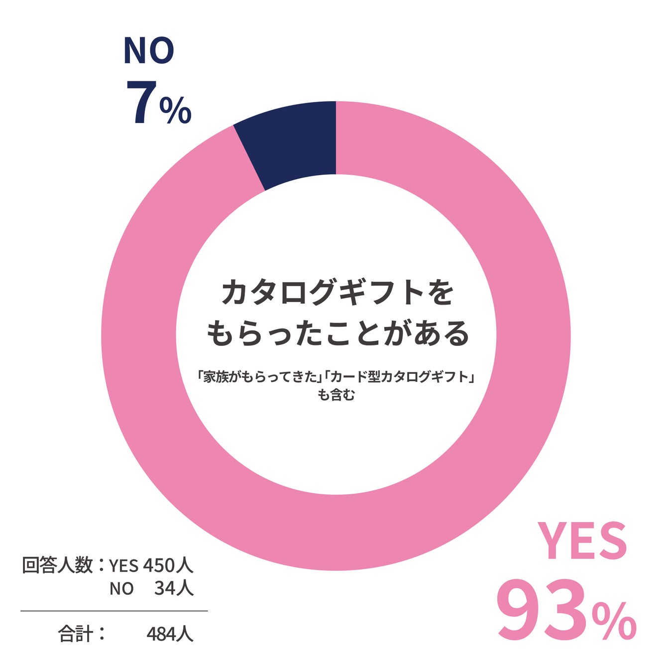 「引き出物にカタログギフトをもらったことがある?(「家族がもらってきた」「カード型カタログギフト」も含む)」という問いに対しては93%の人が「ある」と回答しています。