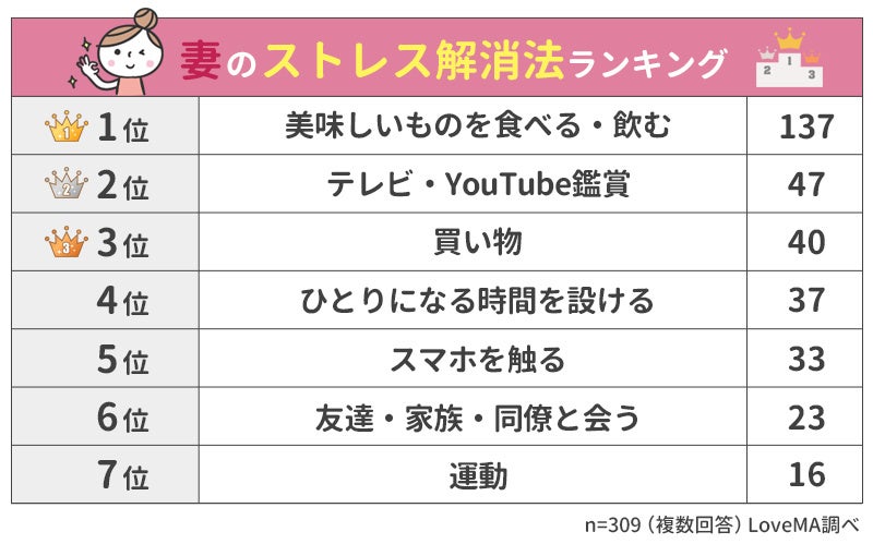 ・妻のストレス解消法ランキング1位は「美味しいものを食べる・飲む」