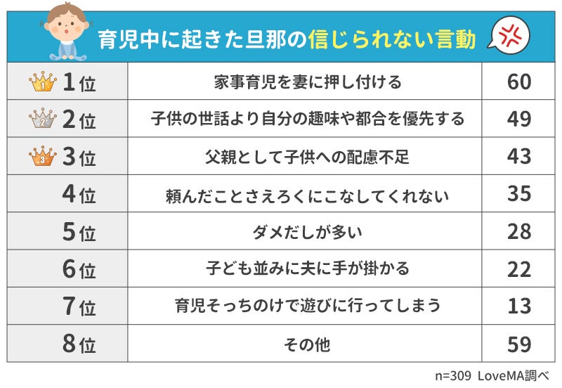 今回、ウェブスターマーケティング株式会社が運営するLoveMA!(ラブマ: https://lovema.jp/ )は、子育て経験のある女性309人を対象に「子育て中に起こった旦那の信じられない行動」に関するアンケート調査を実施しました。