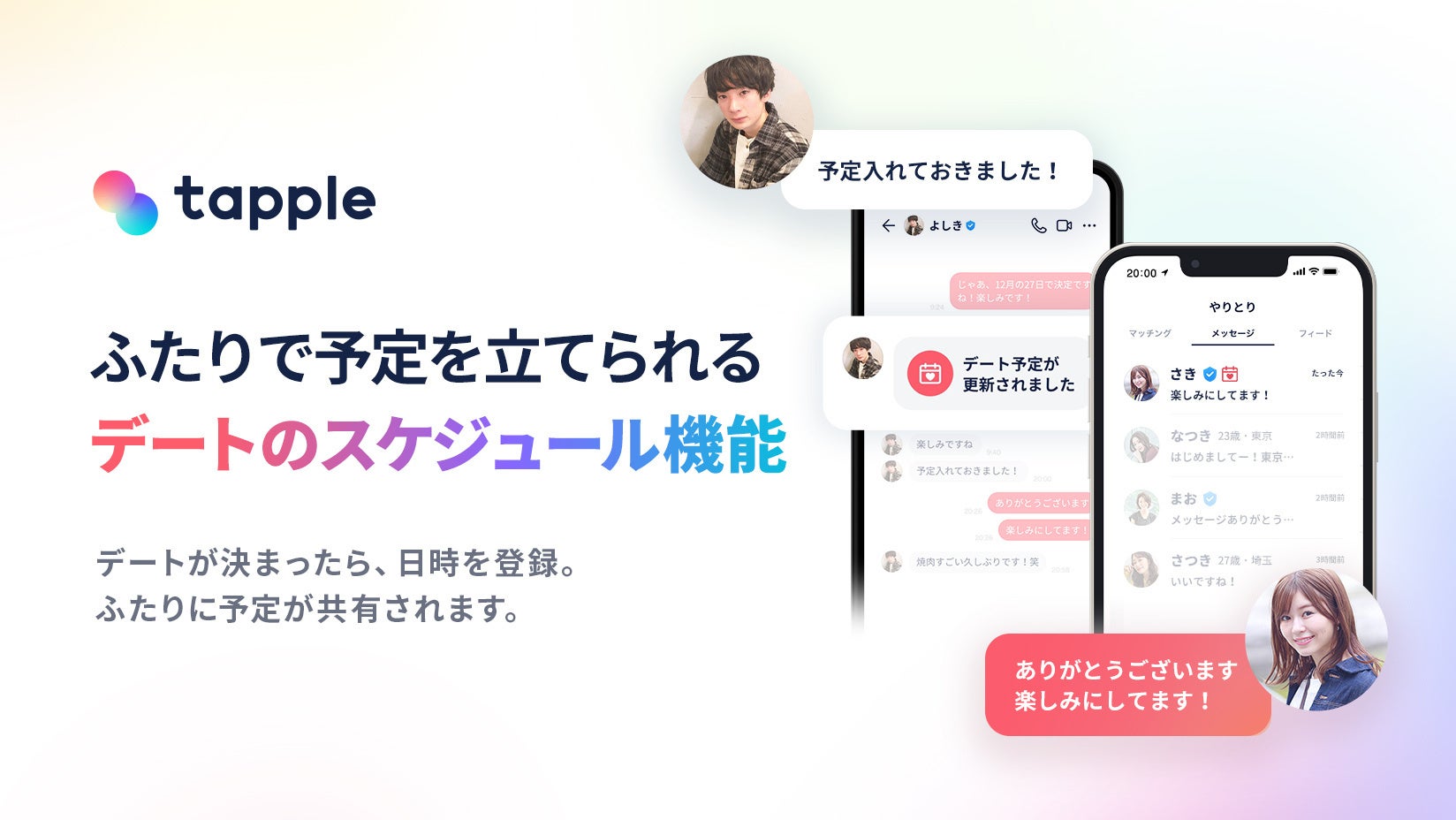 株式会社タップル(本社:東京都渋谷区、代表取締役社長:飯塚勇太)は、運営するマッチングアプリ「タップル」において、2022年4月28日(木)より、マッチングしたお相手とのデートの日時を登録できるスケジュール機能の提供を開始いたします。