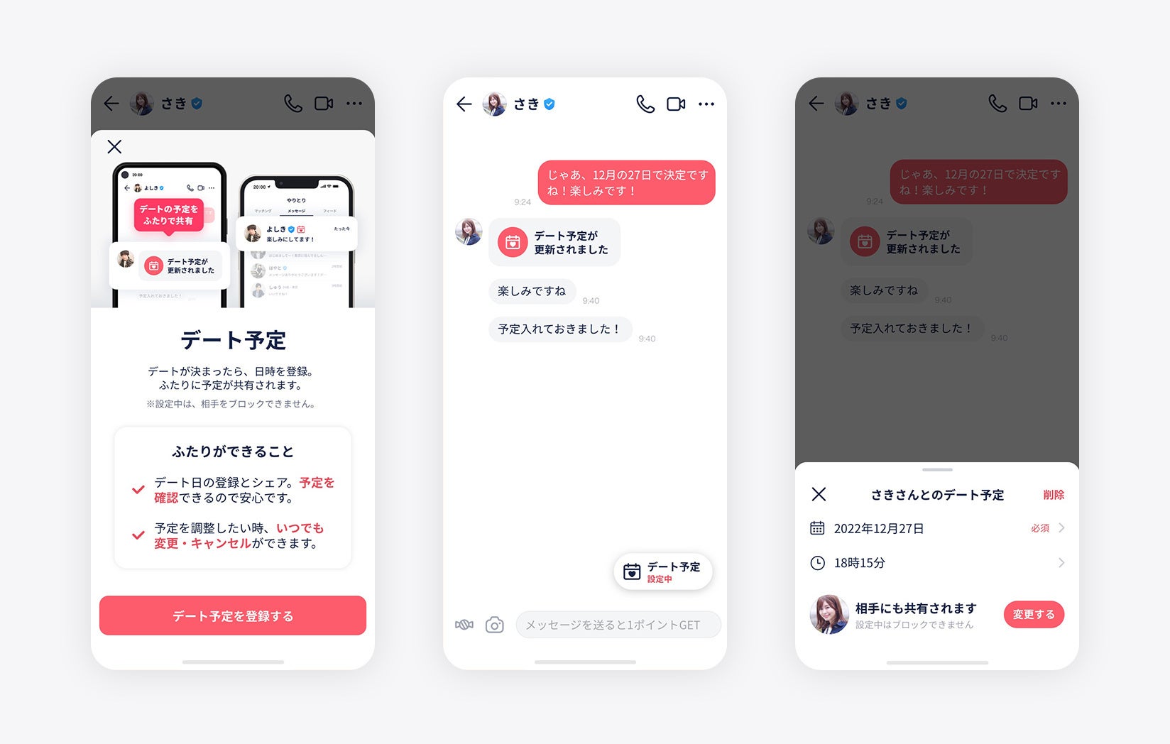 デートの日程が決まった後に、急なキャンセルや日程を勘違いしていたなどのコミュニケーションによるすれ違いを防ぎ、スムーズに予定を確認していただけるようになります。