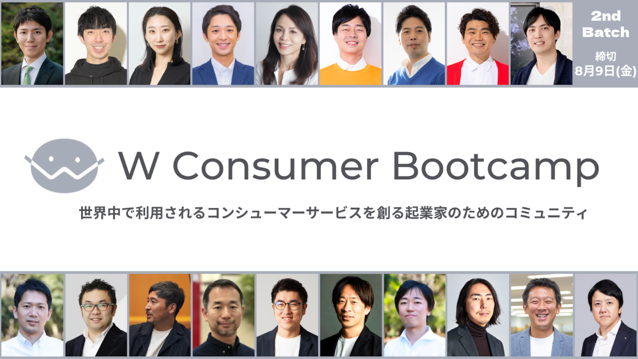 多くのユーザーに届くコンシューマーサービスを創るべく、日夜最前線の試行錯誤の中からベストプラクティスが生まれています。『W Consumer Bootcamp』では、日本を代表するコンシューマーサービスに携わる第一人者や、同じ志を持つ起業家仲間と最前線を共有できる機会をつくり、皆さんのサービスを急成長させるための環境を提供していきます。2nd Batchとなる今回も新たに時代を切り拓くスタートアップ経営者の皆さまと知見を深める機会を設けることができ大変嬉しく思っております。次世代のスタンダードとなるコンシューマーサービスを創る起業家の皆さん、是非プログラムをご活用ください!