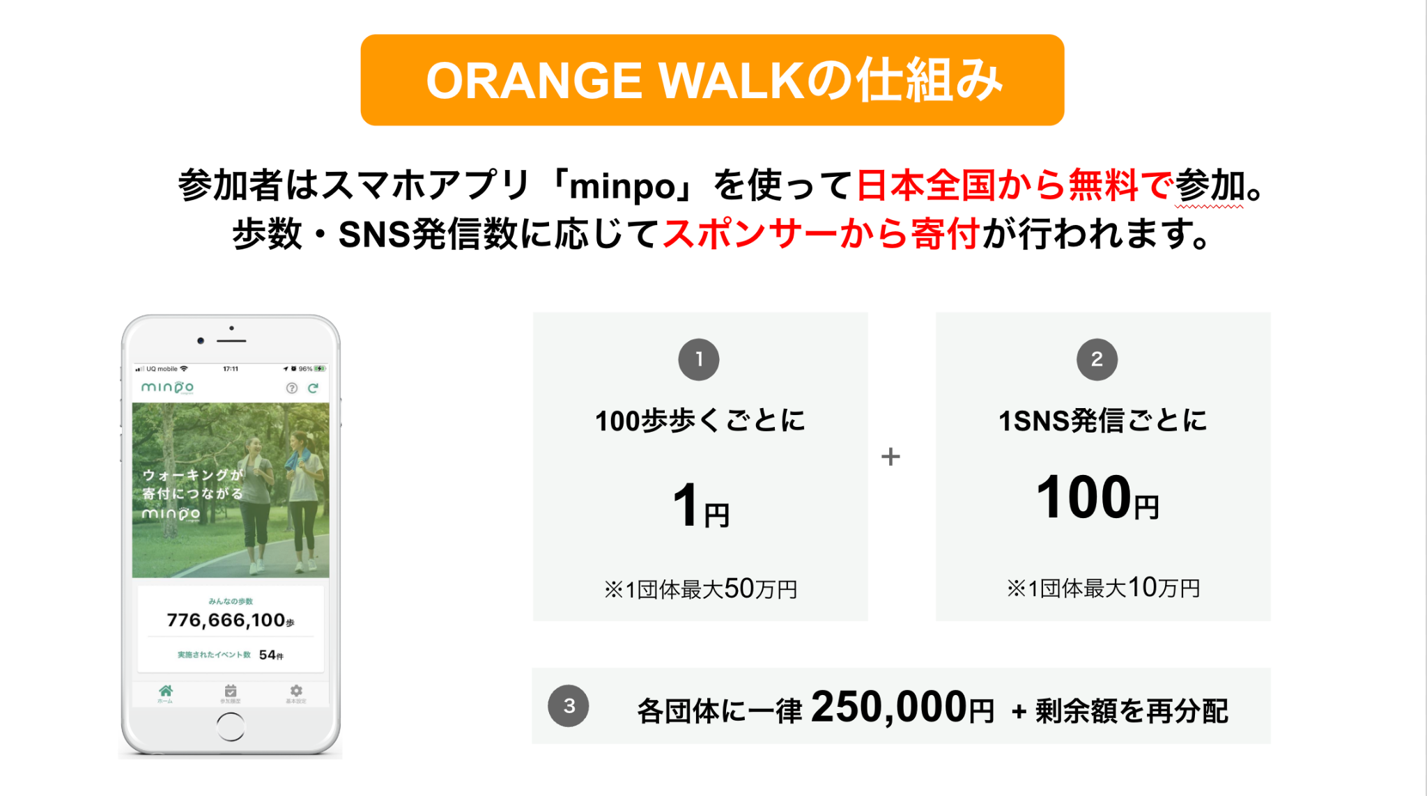 イベント期間中のエントリー人数と、スマートフォンの歩数計測アプリ「minpo」で計測される参加者の累計計測歩数に応じて、スポンサーからマッチング寄付が届けられます。