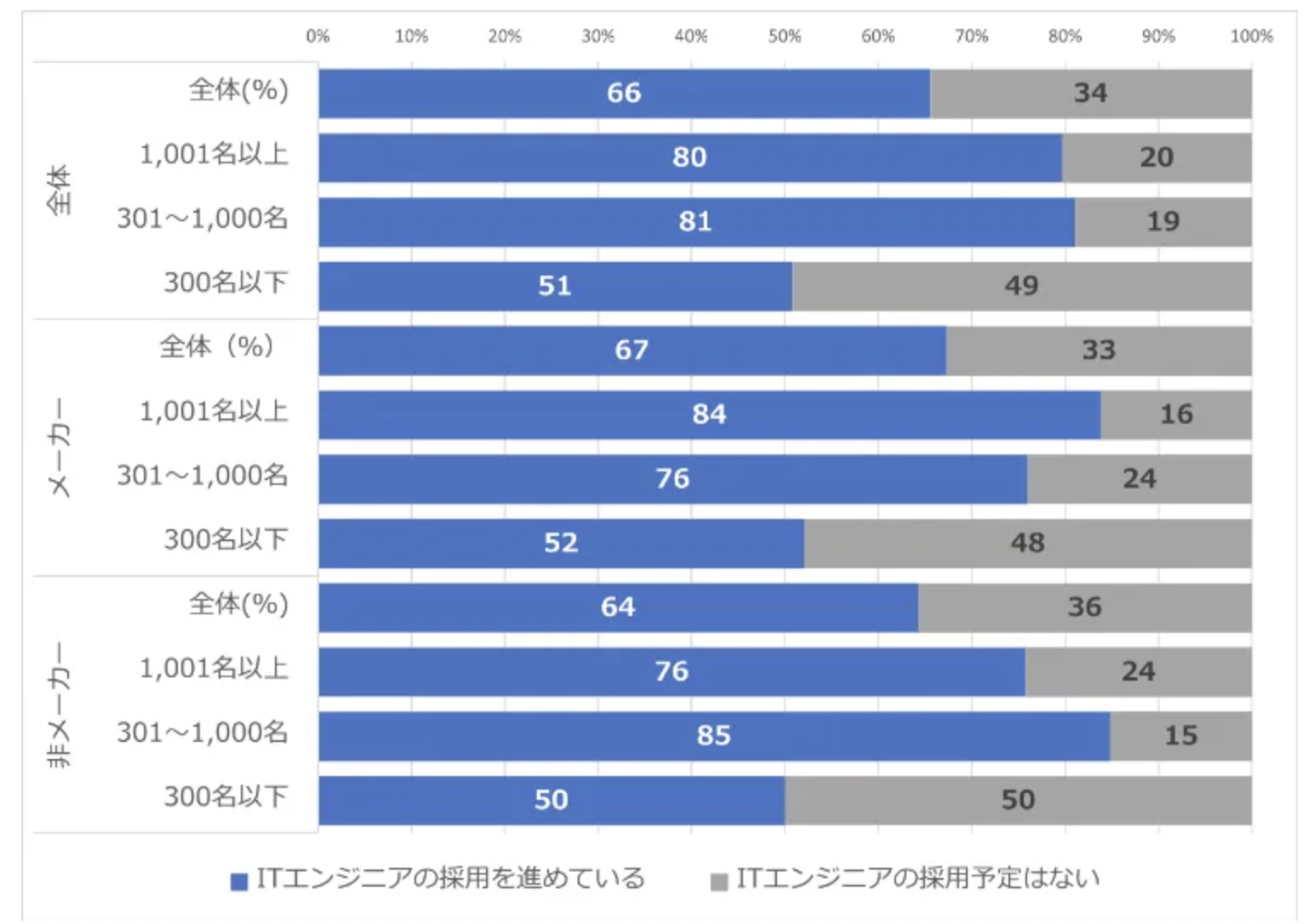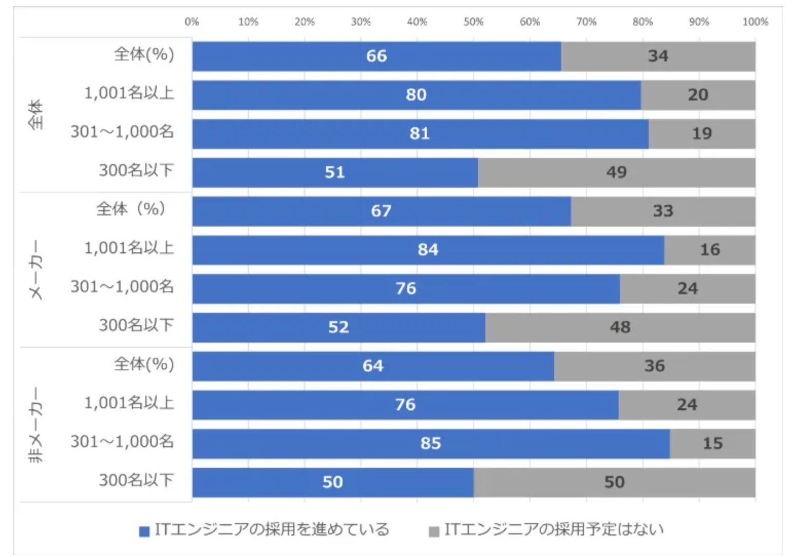 「ProFuture株式会社/HR総研」の調査によれば、ITエンジニアの採用に取り組んでいる企業は中堅・大企業で8割、特に大手メーカーでは84%に上ります。非メーカーの中堅企業でも85%が採用の意向を示しています。