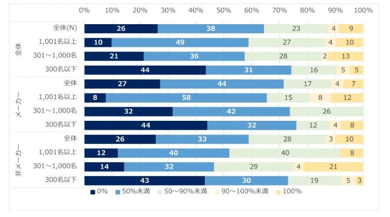 また、2022年度のエンジニア採用の達成率についてのアンケートでは、64%の企業が「50%未満」と回答、「0%」と回答した企業は、全体の26%にも及び、中小企業では44%が該当しました。