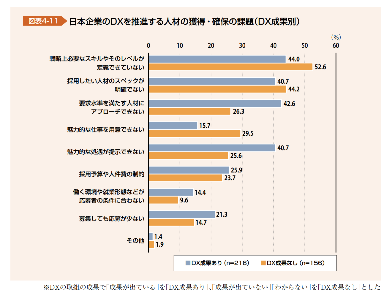 また、日本企業のDXを推進する人材の獲得・確保の課題を尋ねた結果について、「戦略上必要なスキルやそのレベルが定義できていない」、「採用したい人材のスペックが明確ではない」がDX採用において成果がでている企業、成果なしの企業共にで大きな課題になっているという結果が挙げられています。