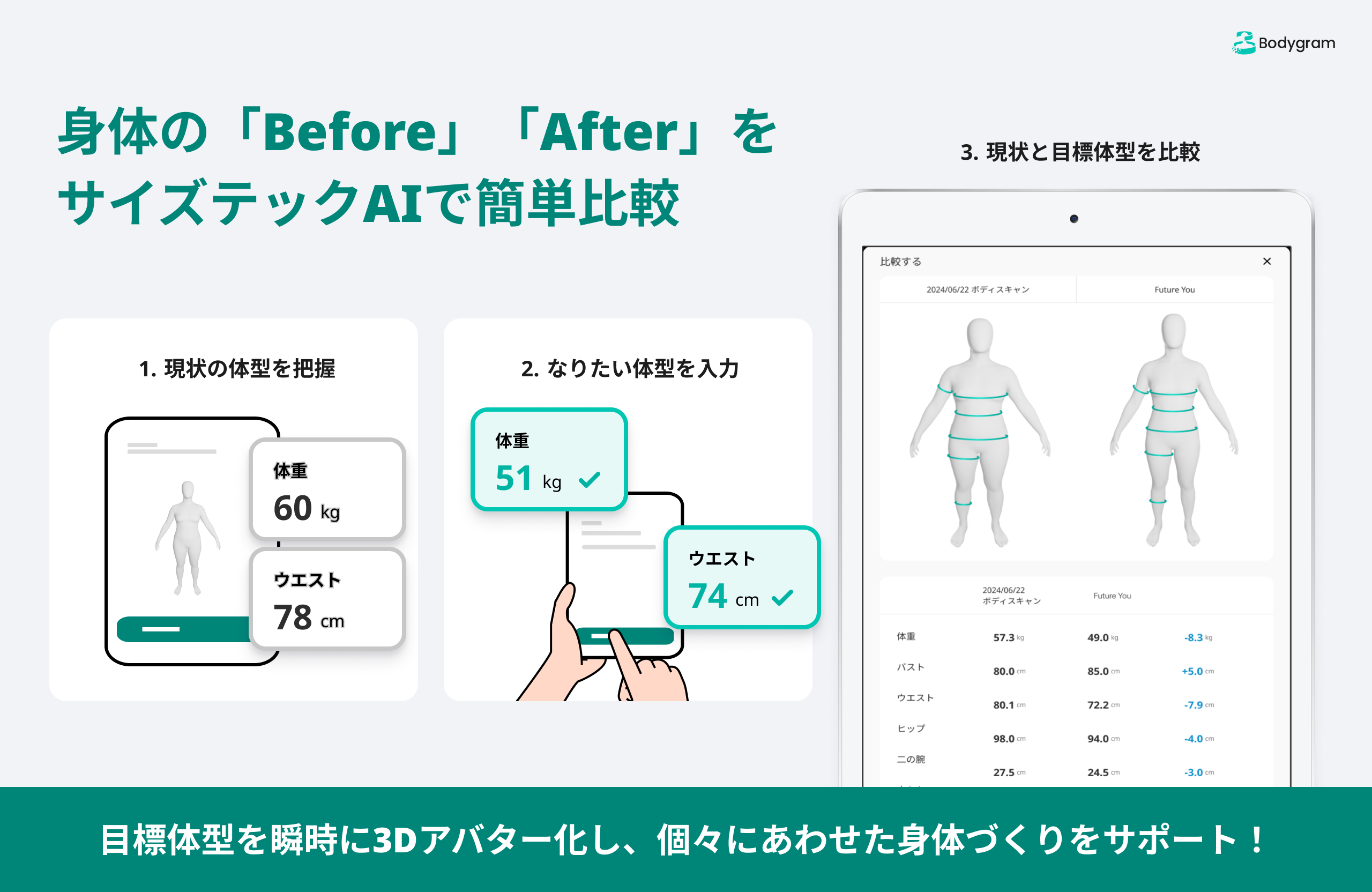 B2Bボディスキャンソリューション「Bodygram」が新機能「Future You(フューチャー・ユー)」を発表!目標・理想とする“未来の体型”をAIが瞬時にアバターで可視化