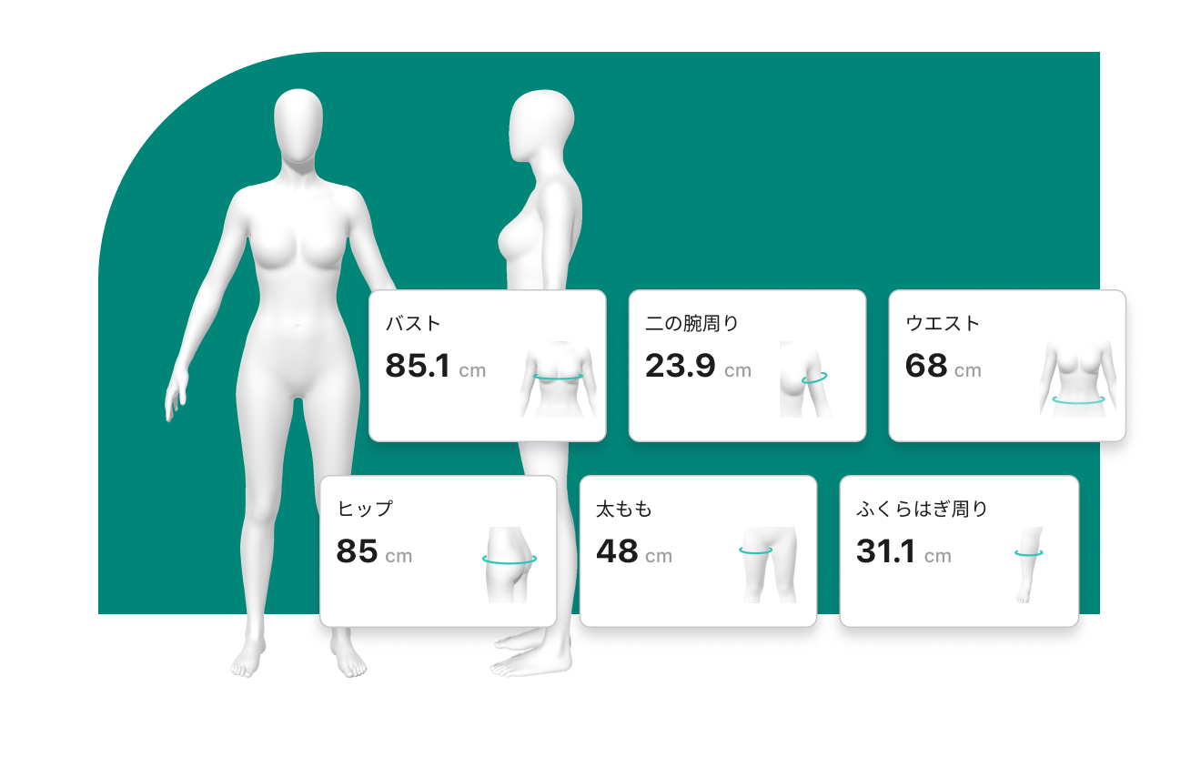 BodygramはAI(人工知能)の学習機能を駆使し身体サイズを推定する先進技術です。年齢・身長・体重・性別を入力し、服を着たままスマートフォンやカメラ付きデバイスで正面と側面の2枚の写真を撮影するだけで被写体の体型を自動で検出し、腹囲・肩幅・手足の長さなど最大で全身33ヶ所の推定計測が可能になります。Bodygramでの計測はISO 8559規格に厳格に準拠しており、これまでBtoB事業において制服やユニフォーム、百貨店といったアパレルをはじめ、寝具やヘルスケア、ビューティーの領域へ技術提供・実用化を果たして参りました。今後もフィットネス、ウェルネスといった様々な分野での活用と展開を計画しています。