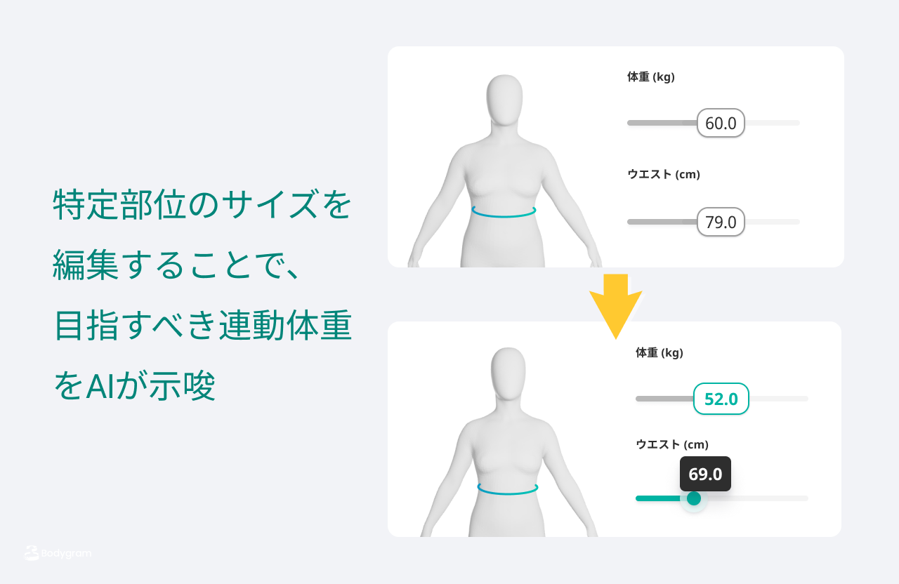 創業から5周年を迎え、Bodygramが蓄えてきた累計200万体のボディスキャンデータ、身体の変化を時間軸で示すトランスフォメーションデータ、日々拡張を続けるAI技術を活用し、この度『なりたい/なり得るであろう身体の状態』を直観的なUIでご提示することが可能になりました。