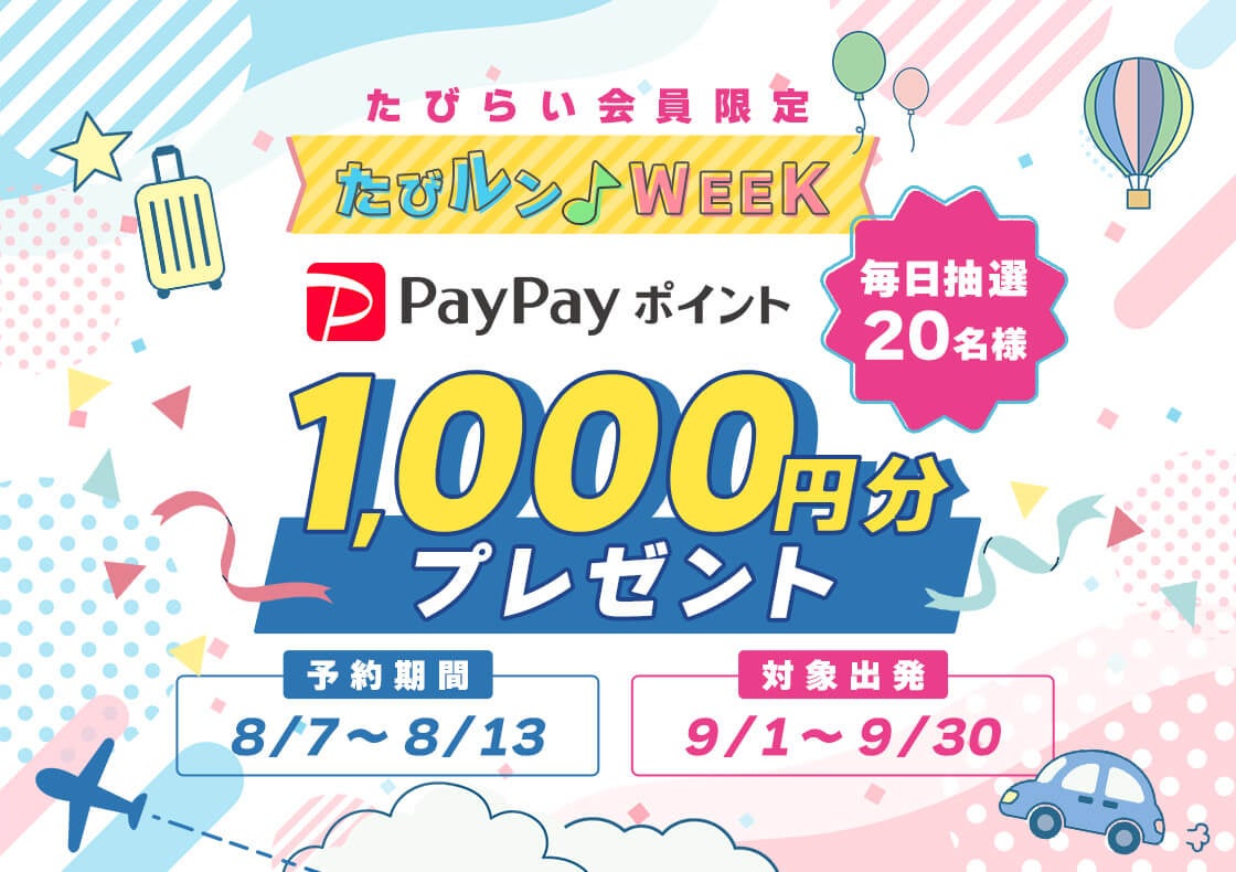 株式会社パム(本社:沖縄県那覇市、社長:長嶺 由成)は、旅行情報サイト「たびらい」のたびらいレンタカー(https://www.tabirai.net/car/)にて、「【たびらい会員限定】たびルン♪WEEK」を開催します。「たびルン♪WEEK」ではたびらい会員限定で、対象の予約日・催行日でたびらいレンタカーをご利用いただいた方の中から、抽選で合計140名様にPayPayポイント1,000円分をプレゼントいたします。