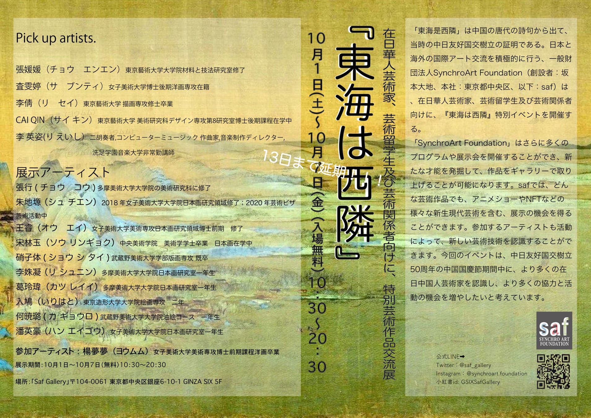 日本と海外の国際アート交流を積極的に行う、一般財団法人SynchroArt Foundation(創設者:坂本大地、本社:東京都中央区、以下:saf)は、在日華人芸術家、芸術留学生及び芸術関係者向けに、『東海は西隣』特別イベントを開催する。