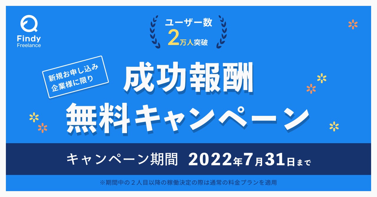 ファインディ株式会社(東京都品川区、代表取締役:山田裕一朗 以下「当社」)は、ハイスキルなフリーランス・副業エンジニアと業務委託案件をマッチングするサービス「Findy Freelance」の登録者ユーザー数20,000人突破を記念し、初回成功報酬無料キャンペーンを実施することをお知らせします。これからエンジニア開発体制を拡大される企業様に、ぜひこちらのキャンペーンをご利用いただければ幸いです。