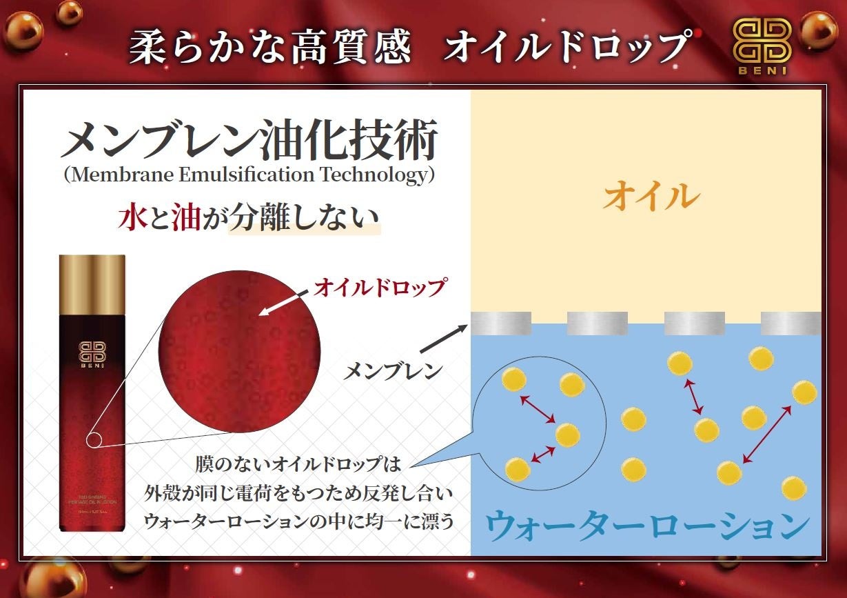 しかし、ヘリテージオイル・イン・ローションは、ブースターローションとしても理想的なオイル:ローション比率であるオイル15%:ローション85%を、“分離させることなく”ミックス。ローションの中でオイルが分離しない秘密は、メンブレン油化テクノロジーを用いていること。