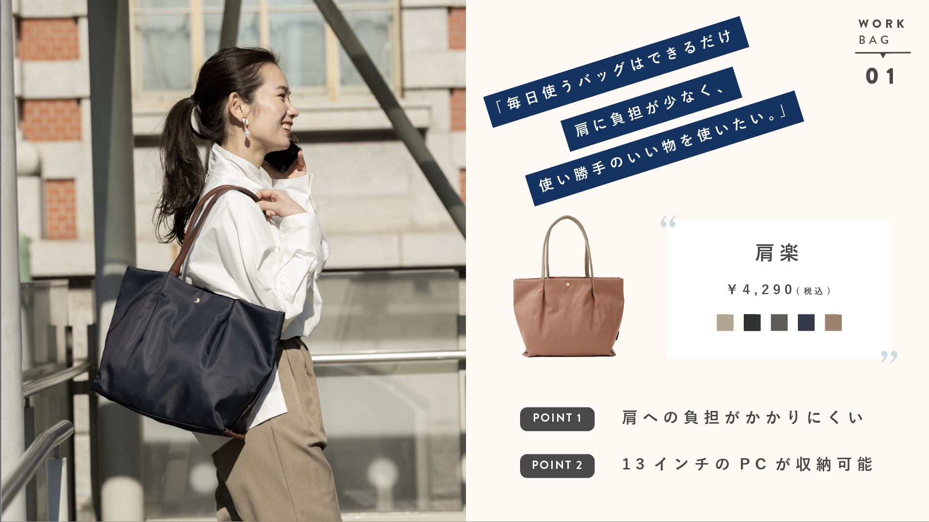 「毎日使うバッグはできるだけ肩に負担が少なく、使い勝手のいい物を使いたい」