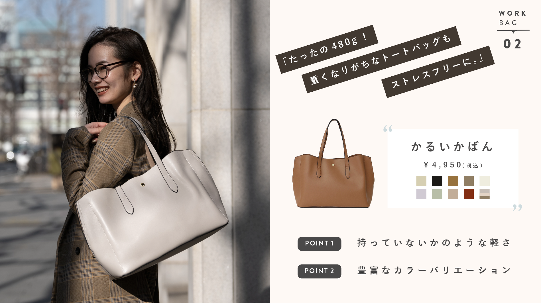 「重さはたったの480g!重くなりがちなトートバッグもストレスフリーに。」
