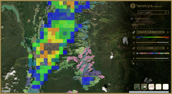 天地人コンパスは、地球観測衛星のビッグデータをはじめとする様々なデータをもとに、解析、可視化、データ提供を総合的に行う土地評価サービスです。農業生産から都市開発まで、様々な目的に合わせてカスタマイズすることが可能となっており、ビジネスにおいて最適な土地を宇宙から見つけることができます。