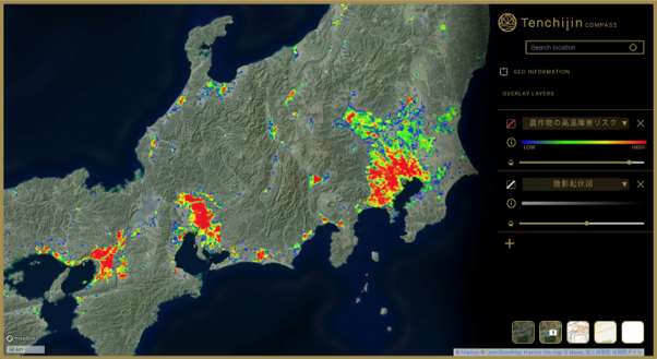 JAXAベンチャー天地人、無料体験できる土地評価エンジン『天地人コンパス Demo』に、世界中のピンポイントの分析に便利な地表面温度や降水量データを追加
