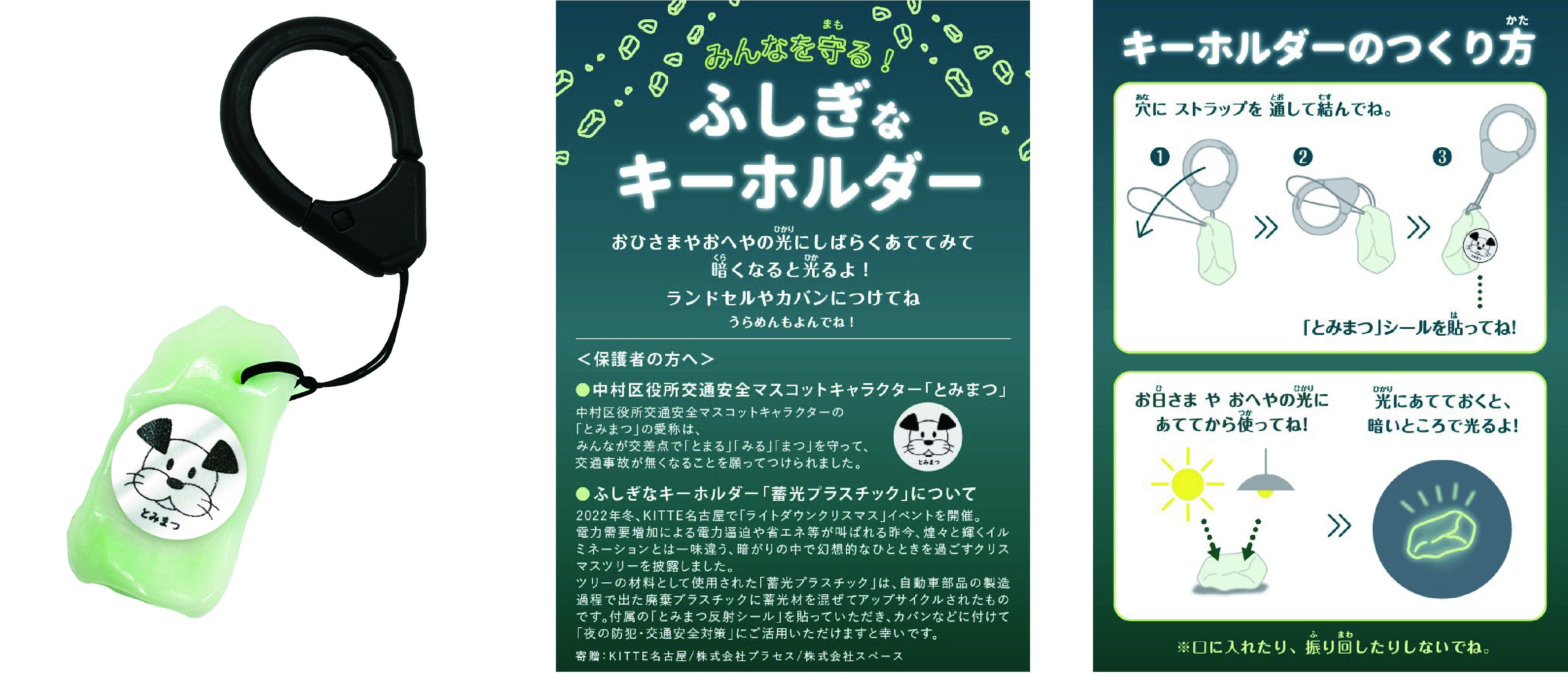 KITTE名古屋と株式会社プラセス(本社:愛知県豊川市、代表取締役:甲村尚久)と株式会社スペース(本社:東京都中央区、代表取締役社長:佐々木靖浩)は地域の安心・安全を願い、中村区安心・安全で快適なまちづくり推進協議会(名古屋市中村区)に、「KITTE名古屋 ライトダウンクリスマス(※1)」で使用されたクリスマスツリーの素材である、リサイクル蓄光プラスチック(※2)をオリジナルキーホルダーとして寄贈することで、交通安全を啓発し、地域に貢献します。