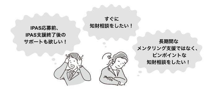 INPITでは、「スタートアップ知財支援窓口」にて、常時、スタートアップを対象とした知財に関する相談を受け付けています。すぐに知財相談をしたい、IPASのメンタリング支援を利用するよりもピンポイントな相談がある、といった場合はスタートアップ知財支援窓口をご利用ください。また、IPAS採択前や、IPAS支援終了後でも窓口をご利用いただけます。