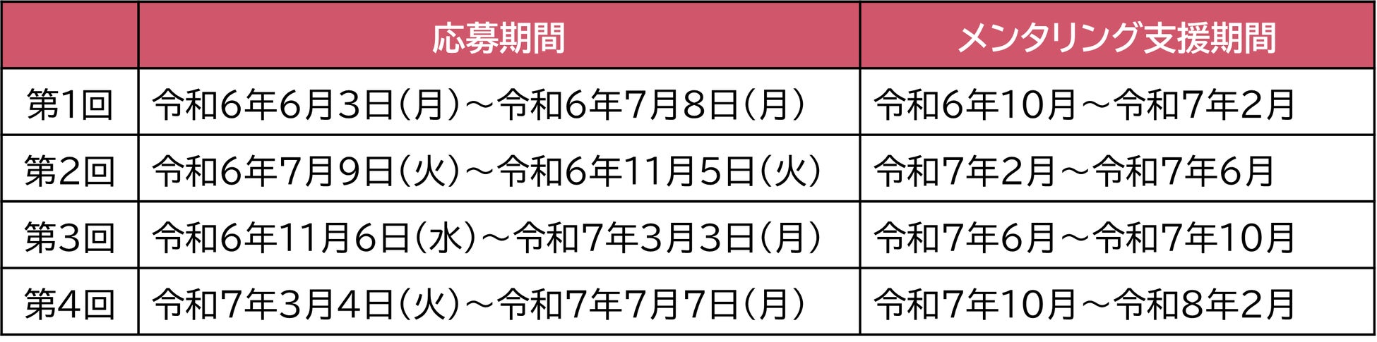 IPASは、令和6年6月3日(月)から通年応募を受け付けますが、応募する時期により支援期間が異なります。下記に応募期間および支援期間を記載しておりますので、奮ってご応募ください。