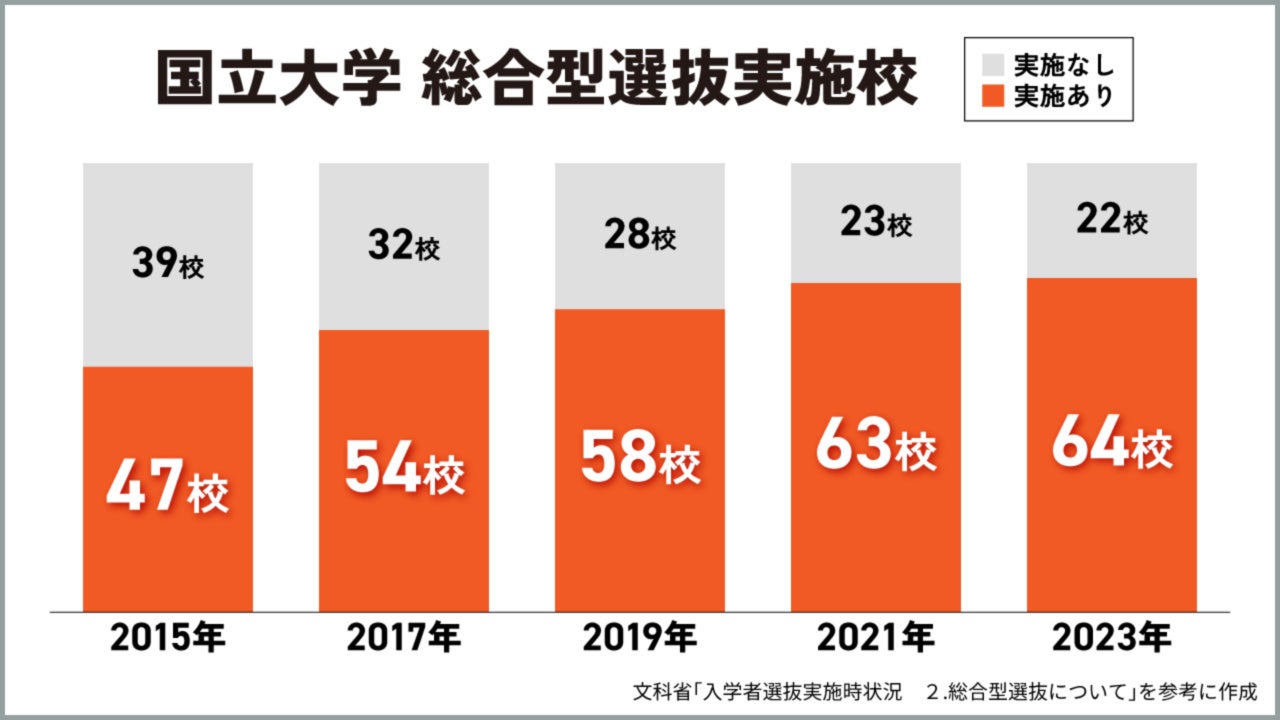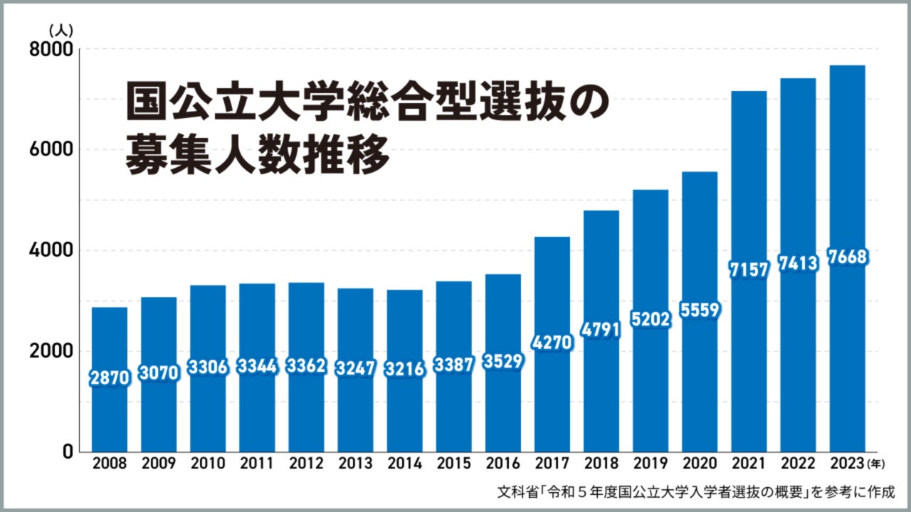 国立大学での総合型選抜導入大学も年々増加し、国公立大学の総合型選抜、推薦入試の募集人数も大きく変化しています。