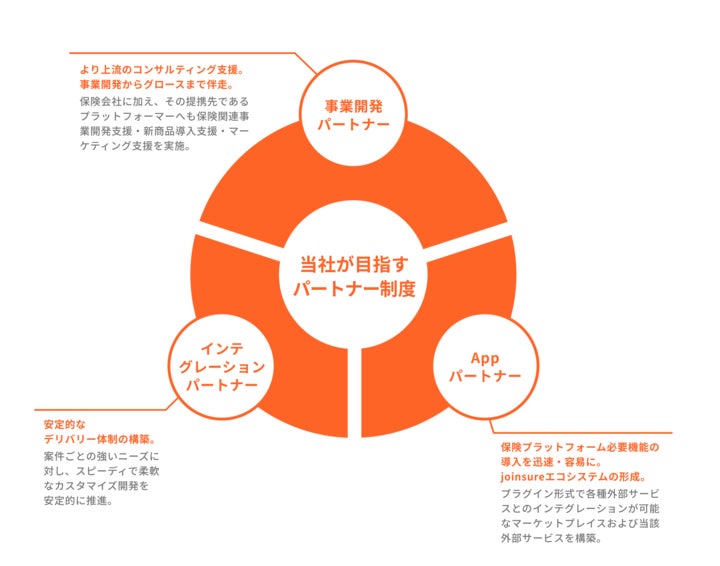 当社は、各種企業へ提供するSaaS型保険システム「joinsure」のさらなる価値向上を図るべく、大手ソリューションプロバイダーをパートナーに迎えて、案件受注時から当社とパートナーがともにシステムの開発や運営を行い、より細かいニーズに合わせたカスタマイズ開発・運営が可能なパートナー体制を構築していきます。