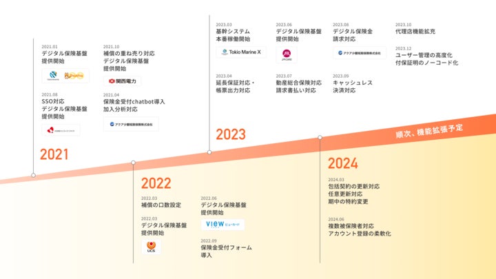 昨年3月には基幹システムの稼働がスタートし、その後も延長保証への対応、動産総合保険への対応、デジタル保険金請求への対応などスピーディーに多くの機能をリリースいたしました。本年もさらなるリリースを計画しており、複数被保険者対応やアカウント登録の柔軟化、ノーコードで設定可能な保険申込・保険金請求フォームのエディタ提供を予定しています。