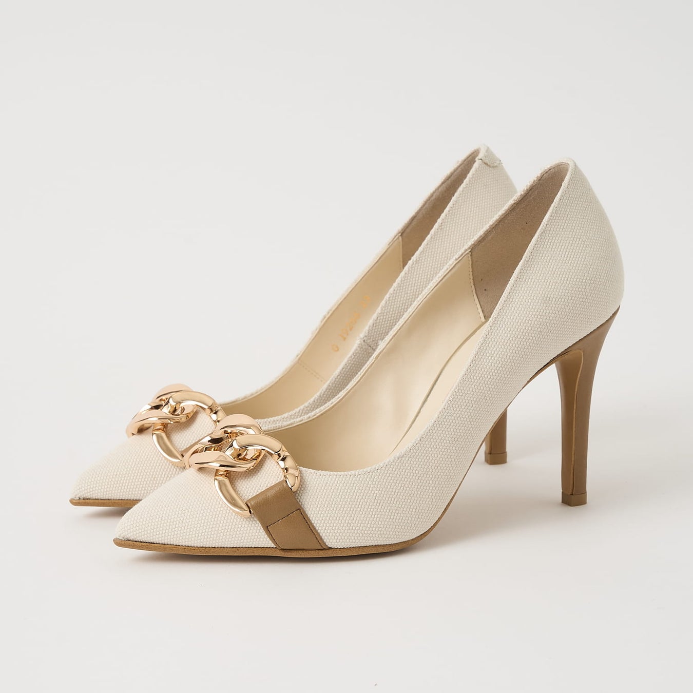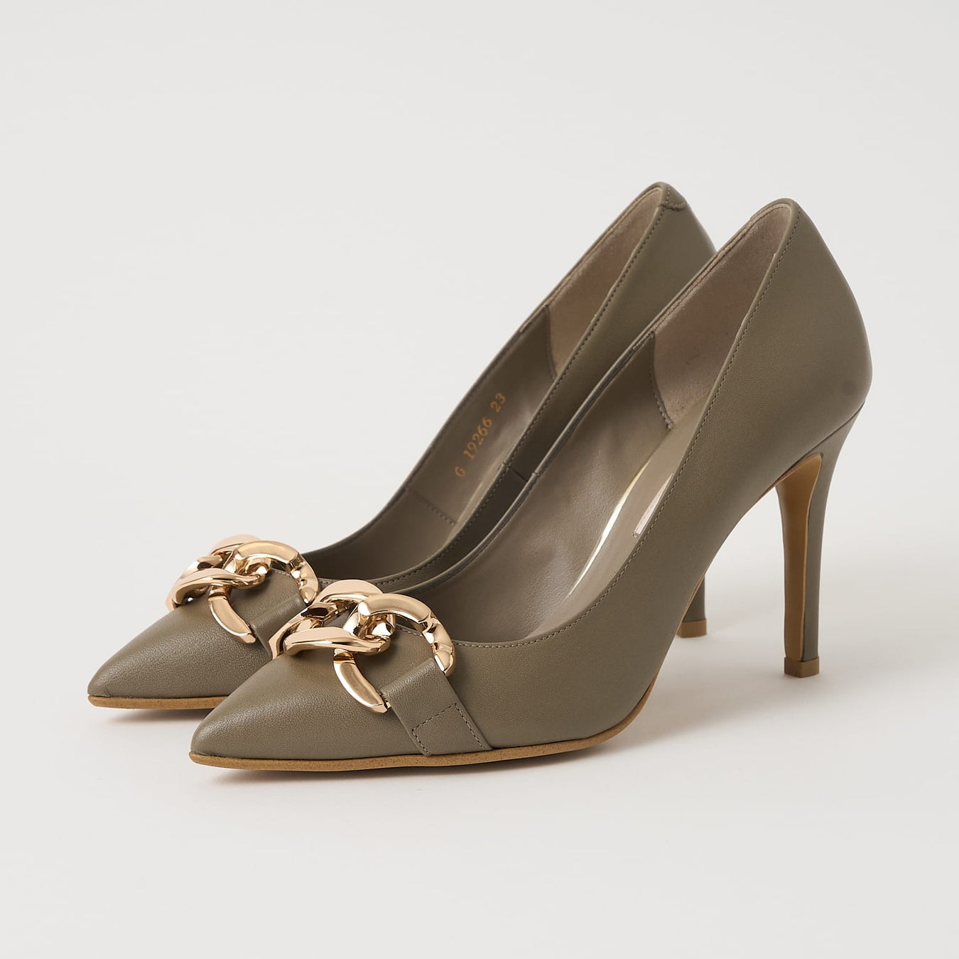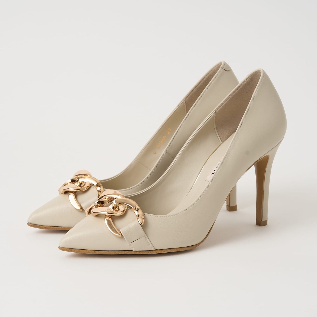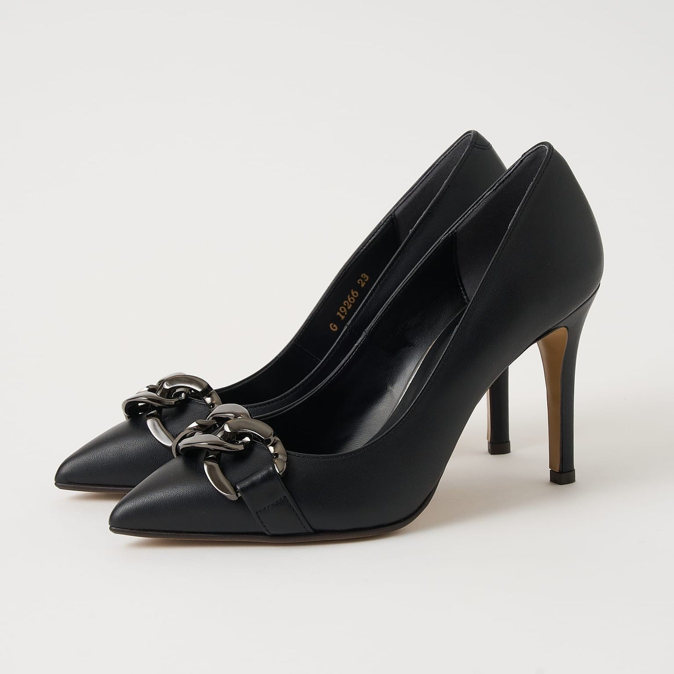 大ぶりチェーンが目を惹くパンプス。ボディにはすっきり見えのレザーを使用し、チェーンデザインでもハード過ぎない大人の印象に仕上げました。