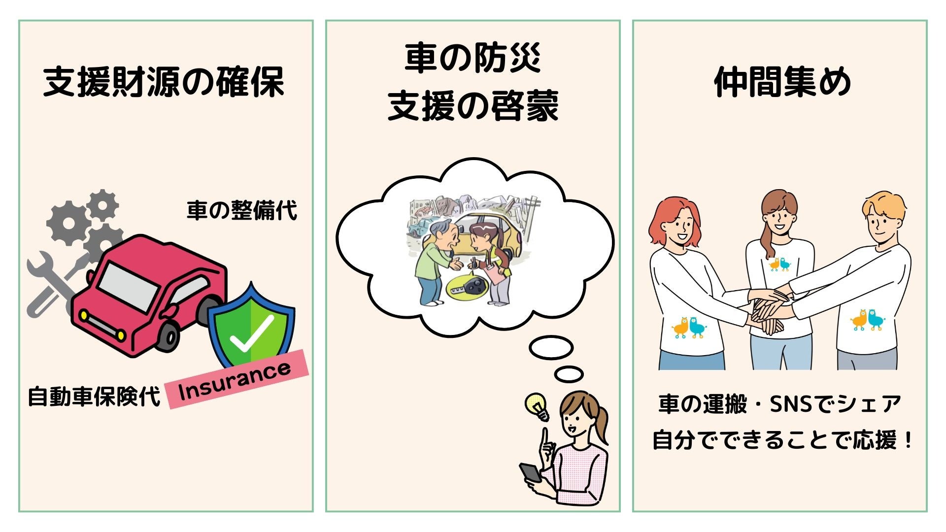 このプロジェクトは、①協会が実施する被災地での車の無償貸出支援(以下、「災害支援」)の財源200万円の資金調達 ②車の防災・支援の啓蒙 ③500人の仲間集め、を実施の目的としています。災害発生時には多くの車両が被害を受け、生活に必要な移動手段が失われており、協会では被災者が生活を立て直すために車の無償貸出しを行っています。クラウドファンディングを通じて集まった資金は、車両の維持管理や災害支援の体制強化のための費用に充てられ、被災地の早期復旧に貢献します。私たちの取り組みに共感し、被災地の方々の生活支援にご協力いただける皆様のご支援をお願い申し上げます。
