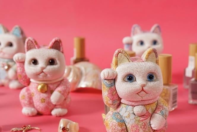 中華圏の若い女性は「華やかなデザイン」を好む傾向があります。そこで招き猫もキラキラした装いとしました。従来の伝統工芸では選ばれない可愛らしい布地を使いながも、職人の手により、「ホンモノ」の仕上がりとなっています。この伝統とモダンの融合を実現したのが、江戸木目込人形の節句人形を手がける柿沼人形です。螺鈿(らでん)の象嵌(ぞうがん)、彩色二衣重などの独自技法の追求、時代を見つめた斬新な人形づくりにも意欲的に取り組んでいます。