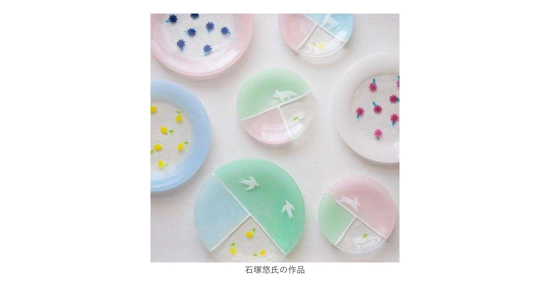 石塚氏の作品は、キルンワークという、電気窯(キルン)を使って制作するガラスアートです。白く不透明なガラスに動物や花などの身近なモチーフを散りばめた、淡い優しい色合いの作品が中華圏女性の心を掴んでいます。