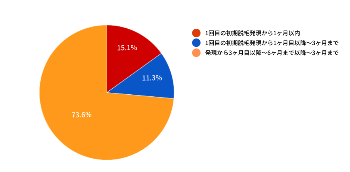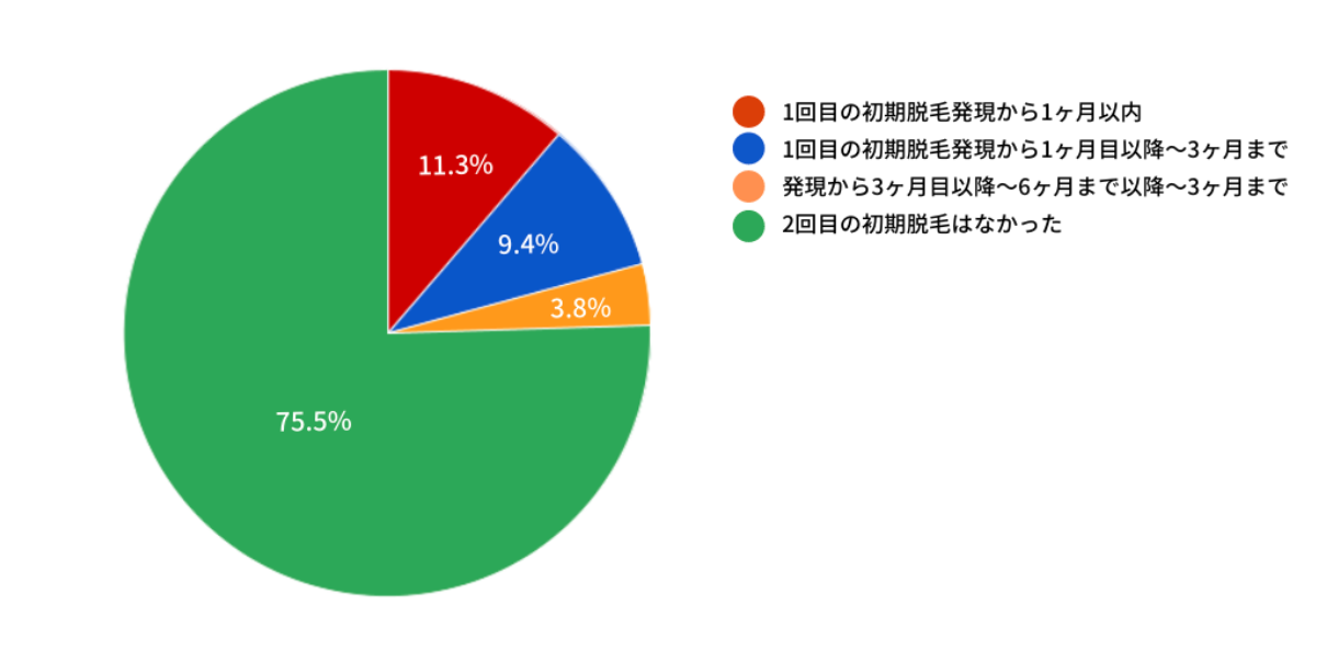 患者様から「2回目の初期脱毛があった」とご相談をいただくことがありますが、こちらも深刻に悩まなくて大丈夫です。今回の調査結果からもわかる通り、初期脱毛が終わらないと回答する方はいません。