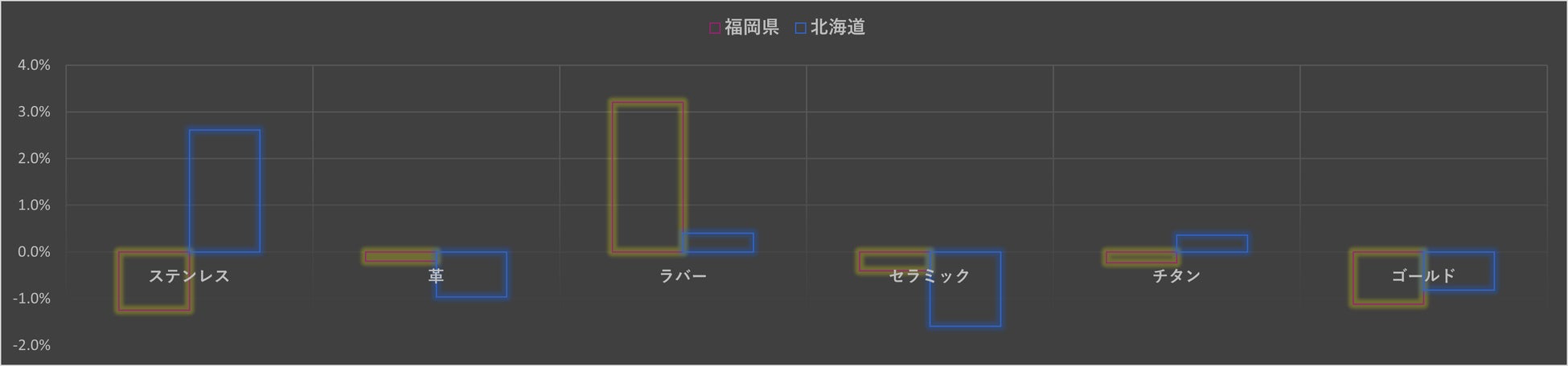 福岡県では圧倒的にラバーベルトが人気です。ラバーベルトのモデルが多いウブロ人気と関連があります。また、福岡はアクティブな生活スタイルの人が多いイメージがありますが、フィット感に優れるラバーベルトへのニーズが高いとも推察されます。