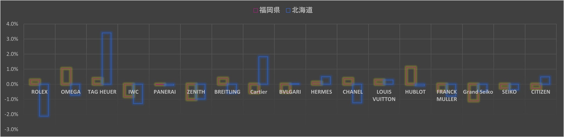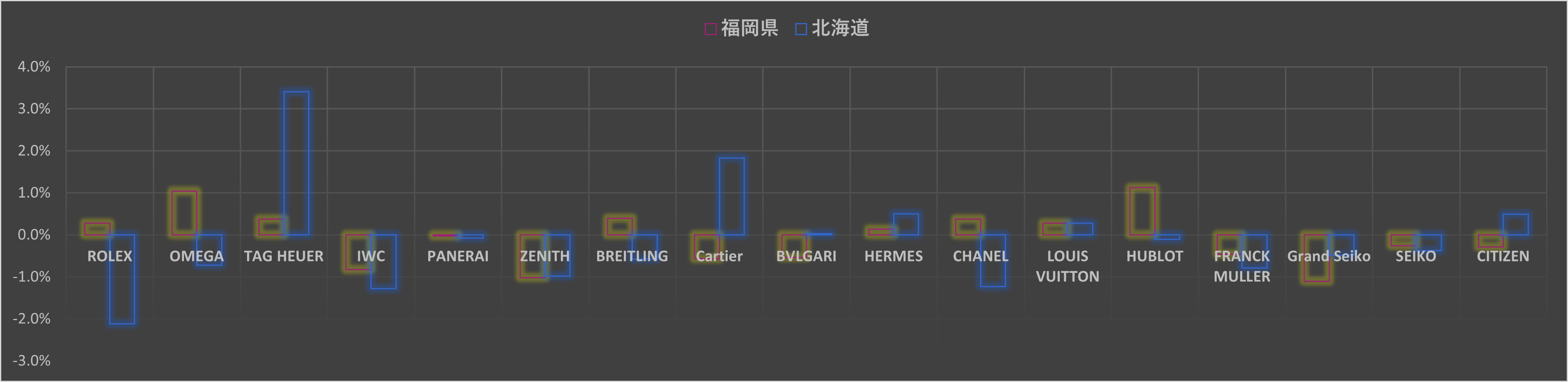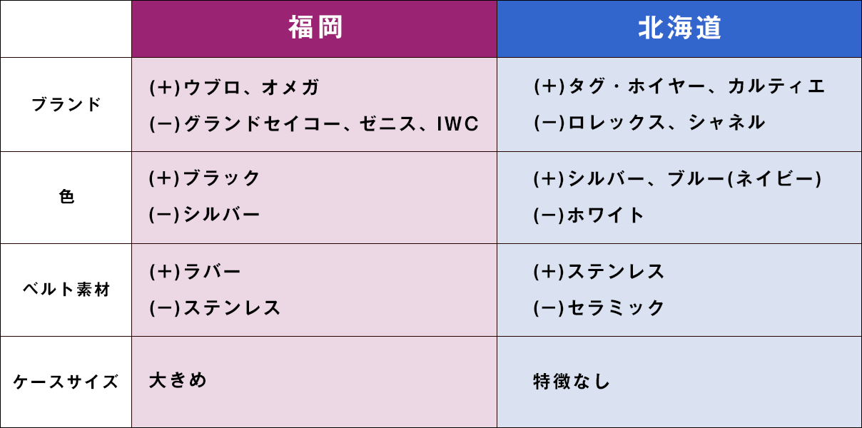 これらの特徴を集約すると下表のとおりです。全体的には、北海道は穏やかで控えめ、福岡県は力強くしっかり主張する印象の腕時計が好まれる傾向があるように思われます。