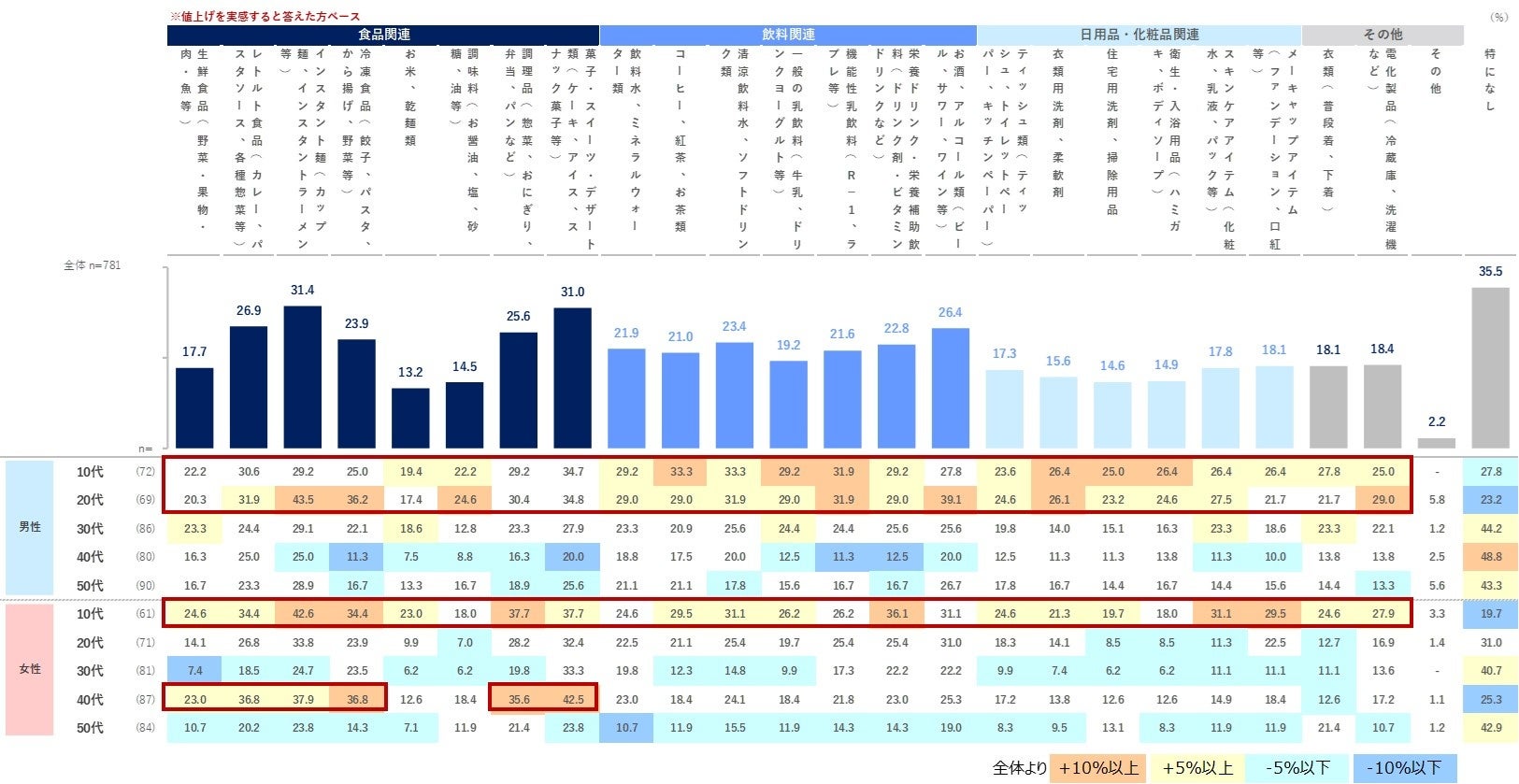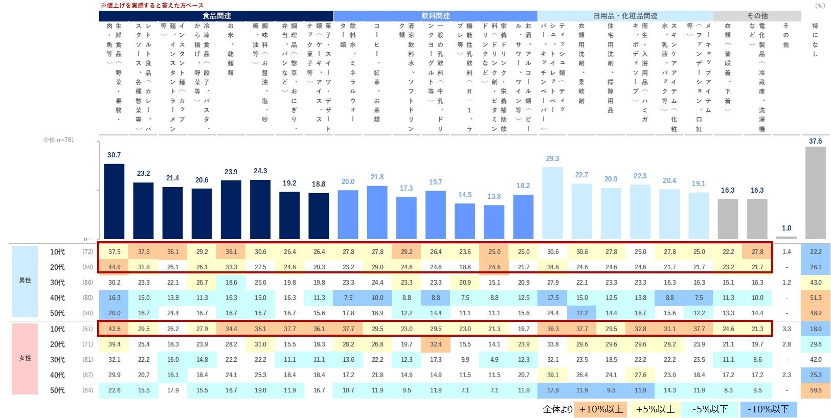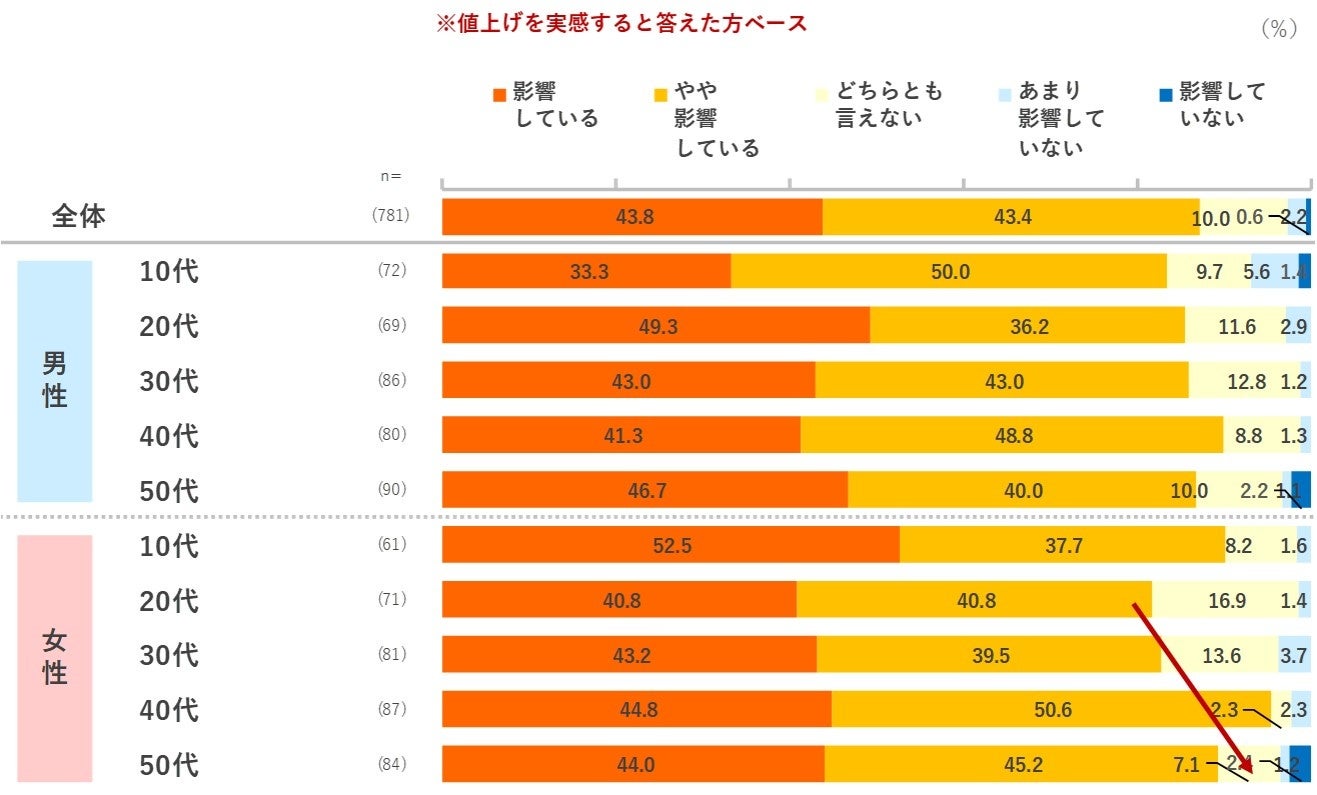 前問までの値上げの実感では、若年層が全体よりやや低かったものの、頻度を減らす・価格帯を下げるともに、男性10・20代、女性10代の数値が全体的に高い傾向がみられました。