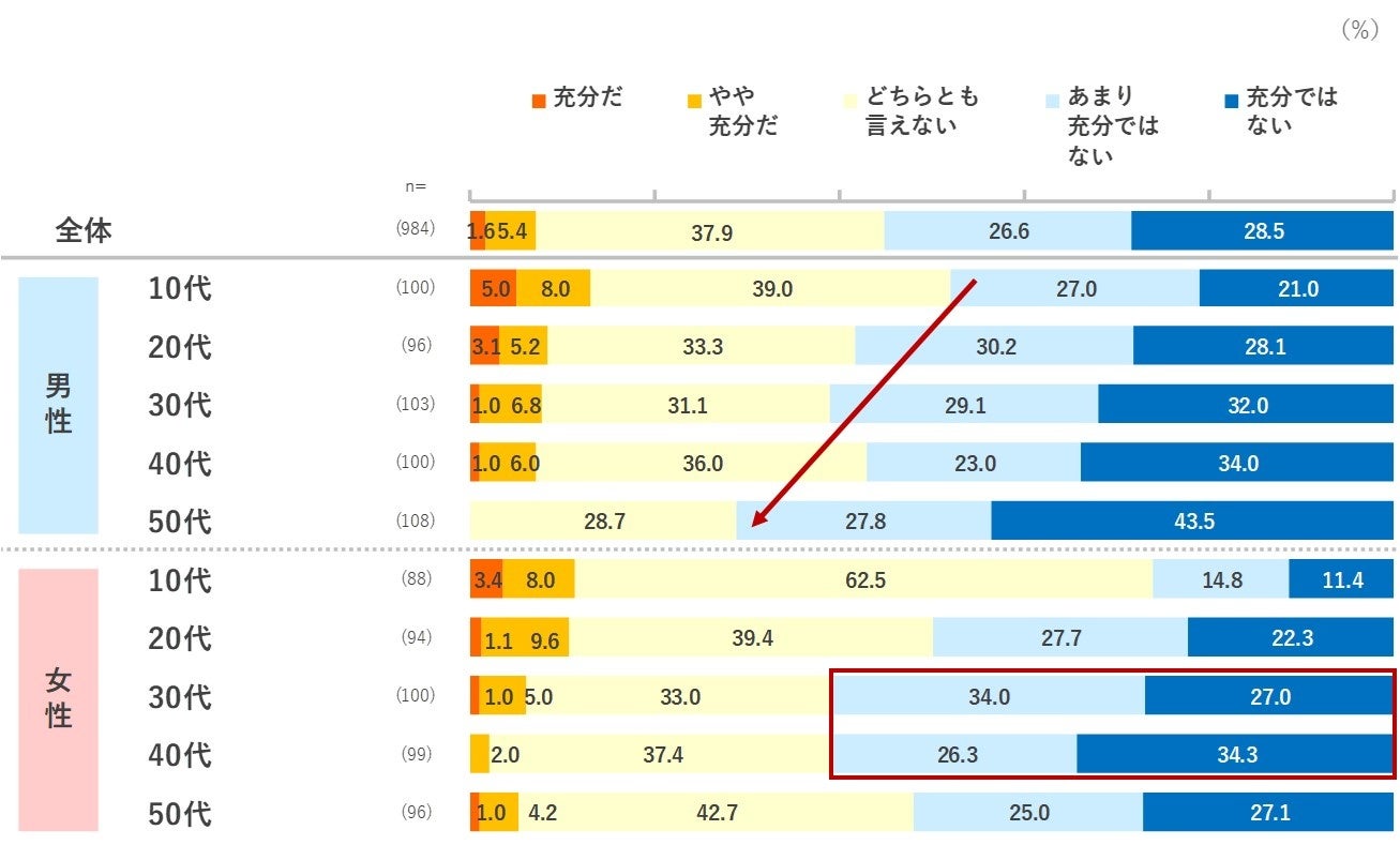 - 値上げに対する政府の対応は「充分ではない」「あまり充分ではない」が55.1%と半数を超えている。男性で、特に年代が上がるにつれ不十分との回答が多くなる。