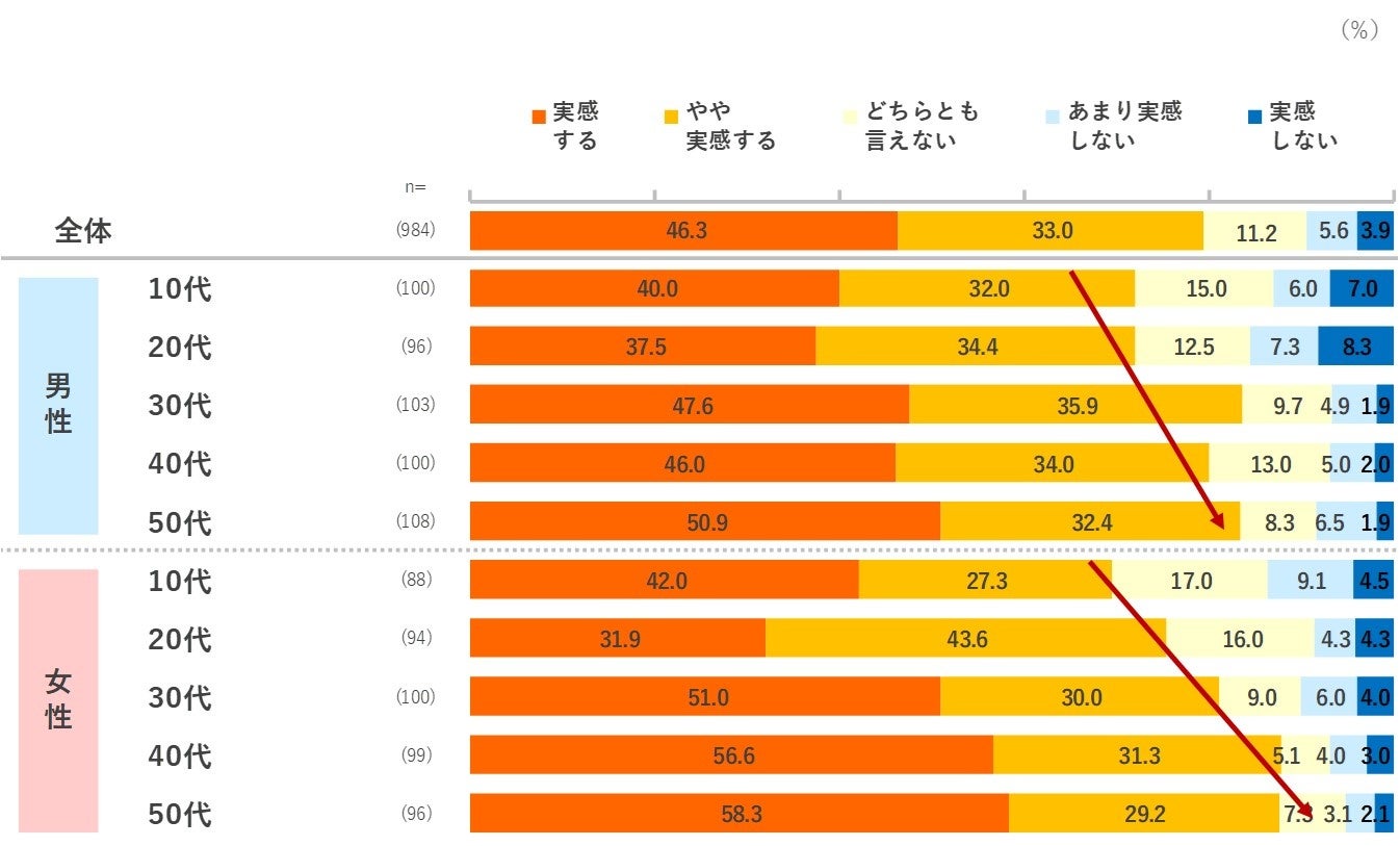 - 2022年に入り、日常生活で物・サービスの値上げを実感しているかを聴取。全体で「実感する」「やや実感する」が79.3%と多数。30代以上は男女とも80%を超える。年代が上がるにつれ、実感度合いは高まり、特に女性が多い。