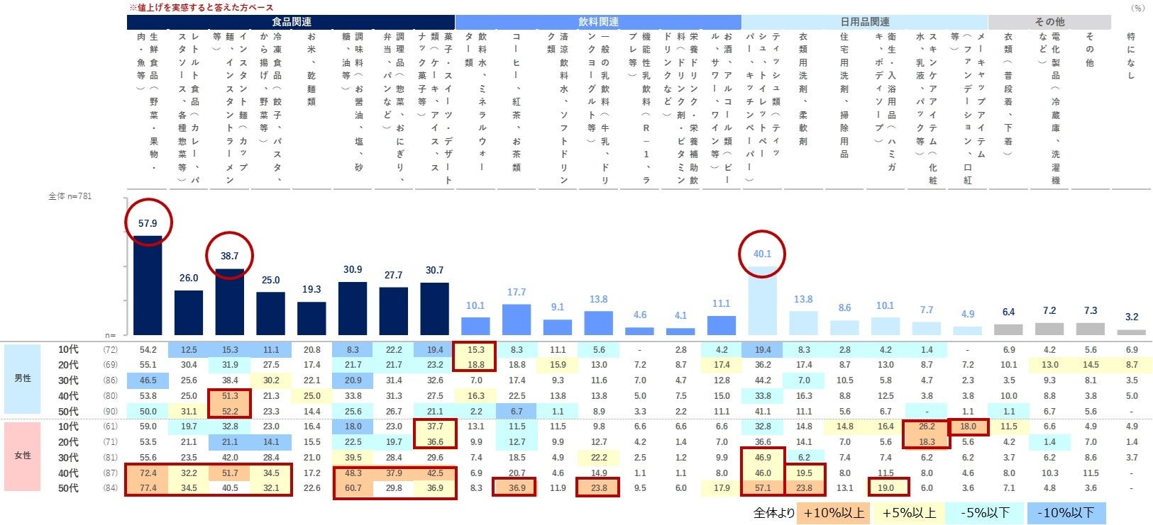 - 「生鮮食品」57.9%、「ティッシュ類」40.1%、「インスタント麺」38.7%が上位。全体的に食品関連の値上げを挙げる人が多く、特に女性40・50代で実感する品目が幅広く多い傾向。一方で、女性10・20代は「化粧品」や「お菓子」、男性10代は「飲料水」への値上げを実感。