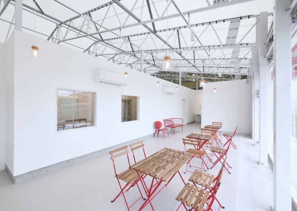 「森町ラボラトリー」はテント状の屋根を採用しています。テント屋根は太陽光を約11%透過できるため、日中は照明を使用しなくても太陽光を利用した明るい室内を実現します。昼間は照明が不要で消費電力を節約できます。自然の恵みを生かした明るい室内は、食品加工場としてだけではなく、地域を盛りあげるコミュニティとして、またワークショップや関係者とのコミュニケーション、食イベントの開催までを視野に入れた新たな憩いの場<IKOIBA>として活用されます。
