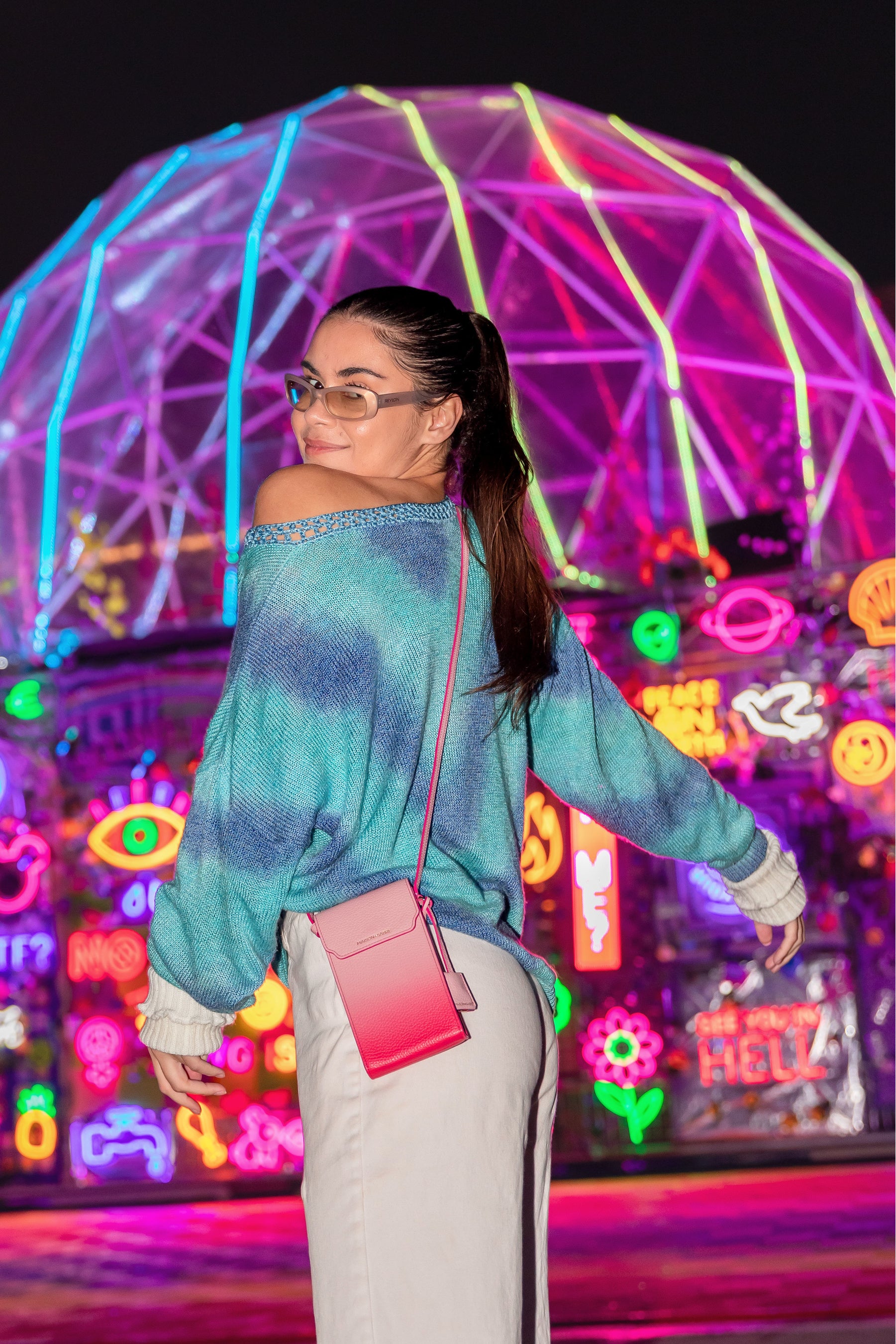 肌身離さず身に付けられるスマホポーチは、スマホの置き忘れや紛失防止に役立ちます。ワンタッチで開け閉めできるマグネットボタン式なので必要な時のみ瞬時にスマホを取り出せます。街中で写真撮影や地図を確認する時にも大活躍。