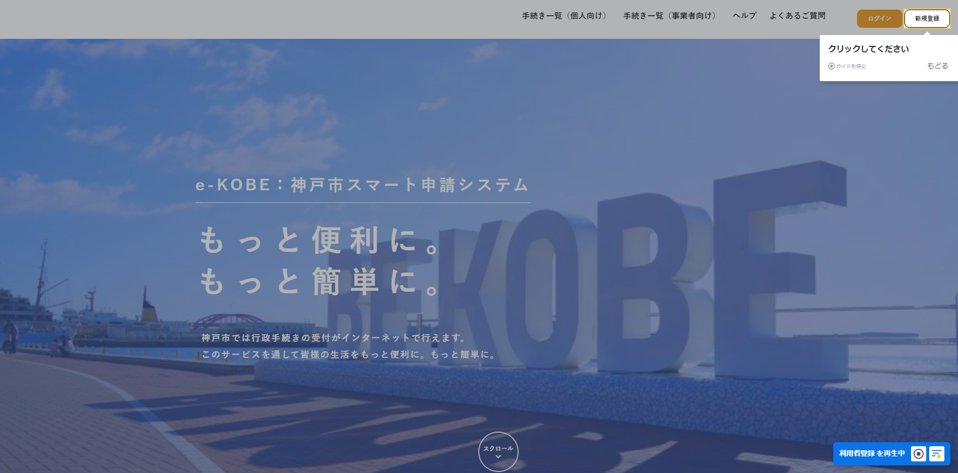 同市にて活用中の電子申請システム「e-KOBE(神戸市スマート申請システム)」のナビゲーションとして