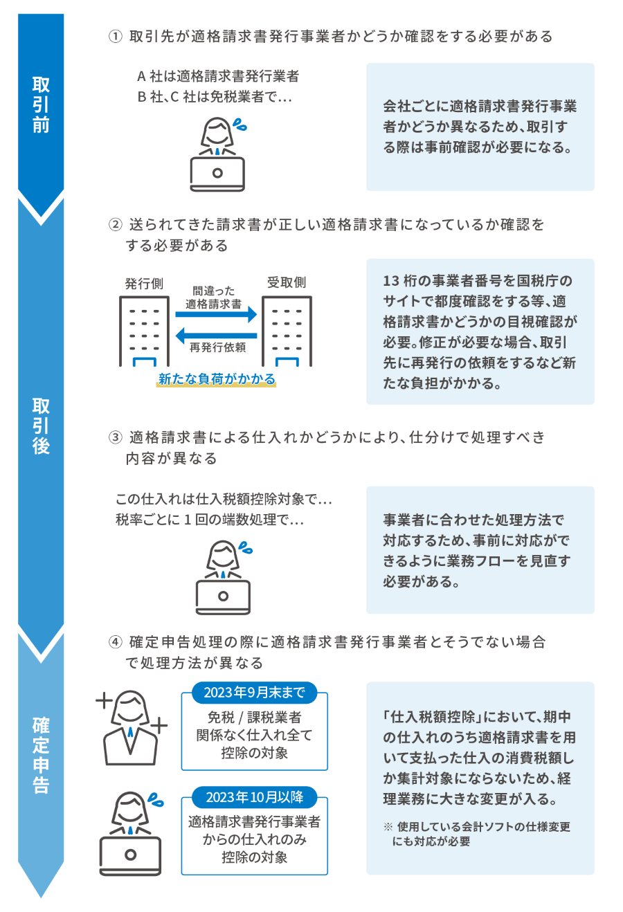 一方で請求書“受取側”も「取引先が適格請求書発行事業者かどうかの確認」、「適格請求書が正しい仕様になっているかの確認」、「適格請求書とそうではない請求書による仕訳処理の違い」など、大きな負荷がかかることが予測されています。