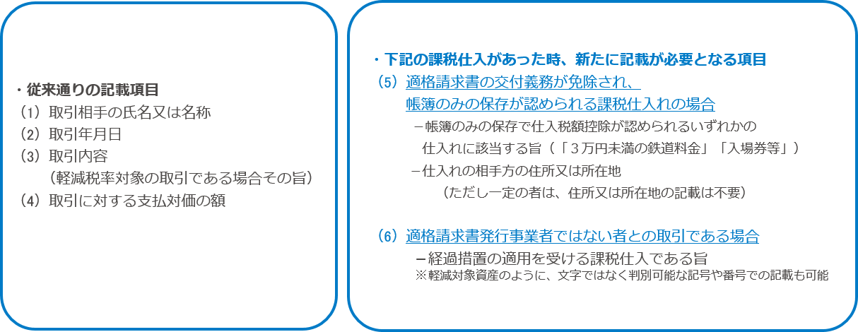 インボイス制度では、仕入税額控除を行う要件として適格請求書と帳簿の保存が必要となります。「帳簿の保存」とは、「インボイス制度で定められている記載事項を記載した帳簿の保存」を指します。従来の記載項目に加え、特定の課税仕入では、新たに必要となる記載項目があります。