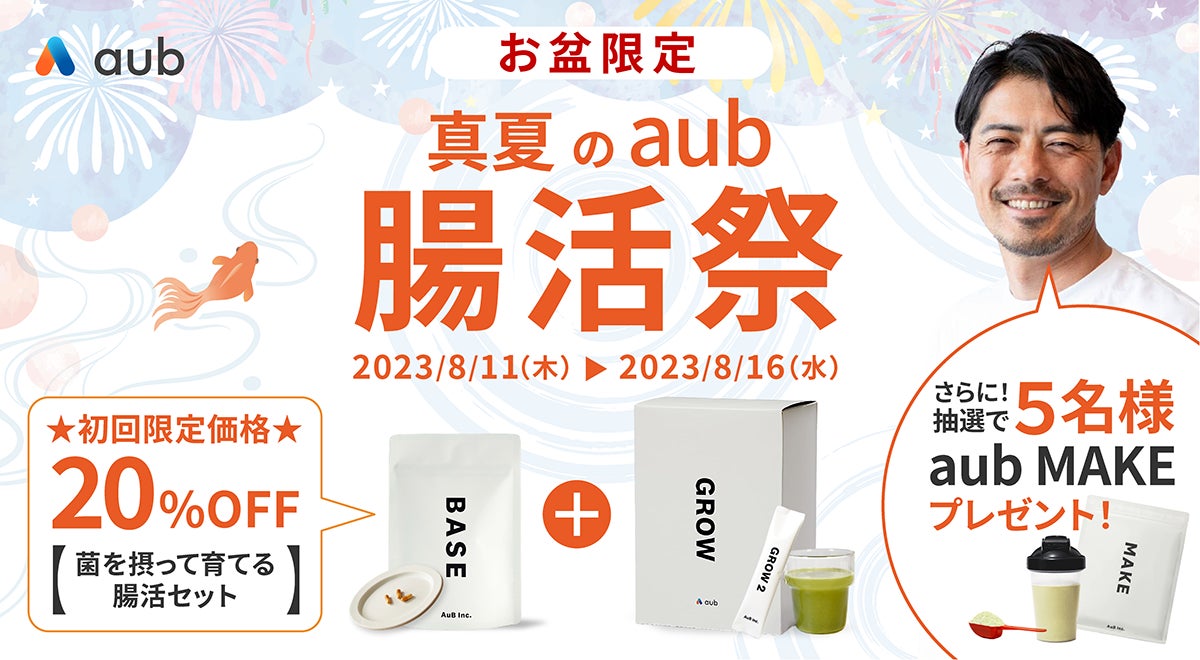 そうした中で「体調を崩さず、夏を楽しく過ごしたい」「やりたいことのために、自身の身体に向き合いたい」「これを機に、腸活を始めたい」という声に寄り添うべく、お盆限定で、初めて腸ケアをする方にとってお得な「菌を摂って育てる腸活セット aub BASE+ aub GROW」を手頃な値段でお買い求めいただけるキャンペーンを実施いたします。