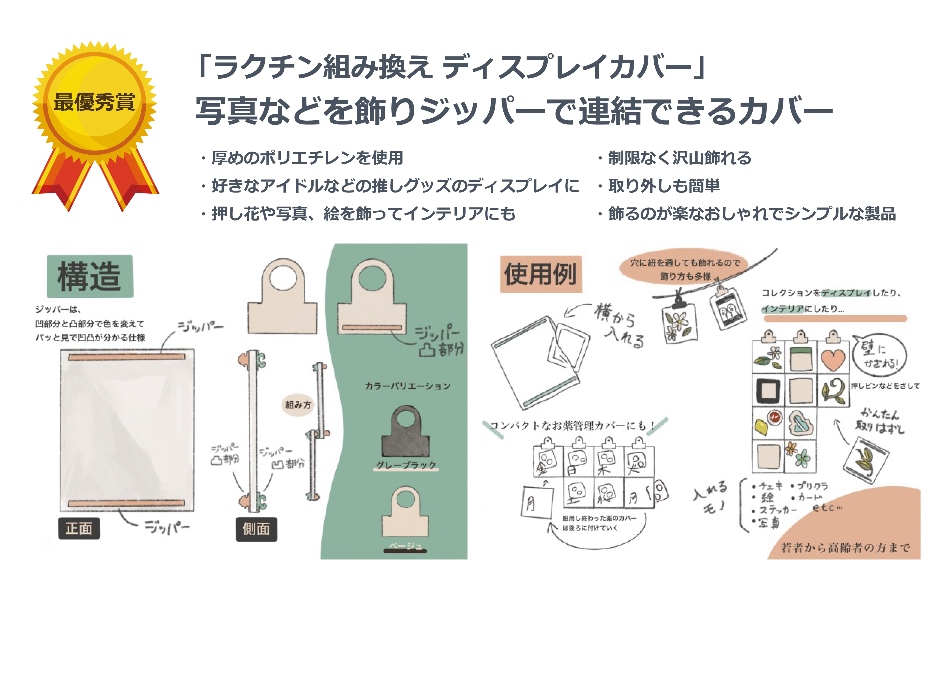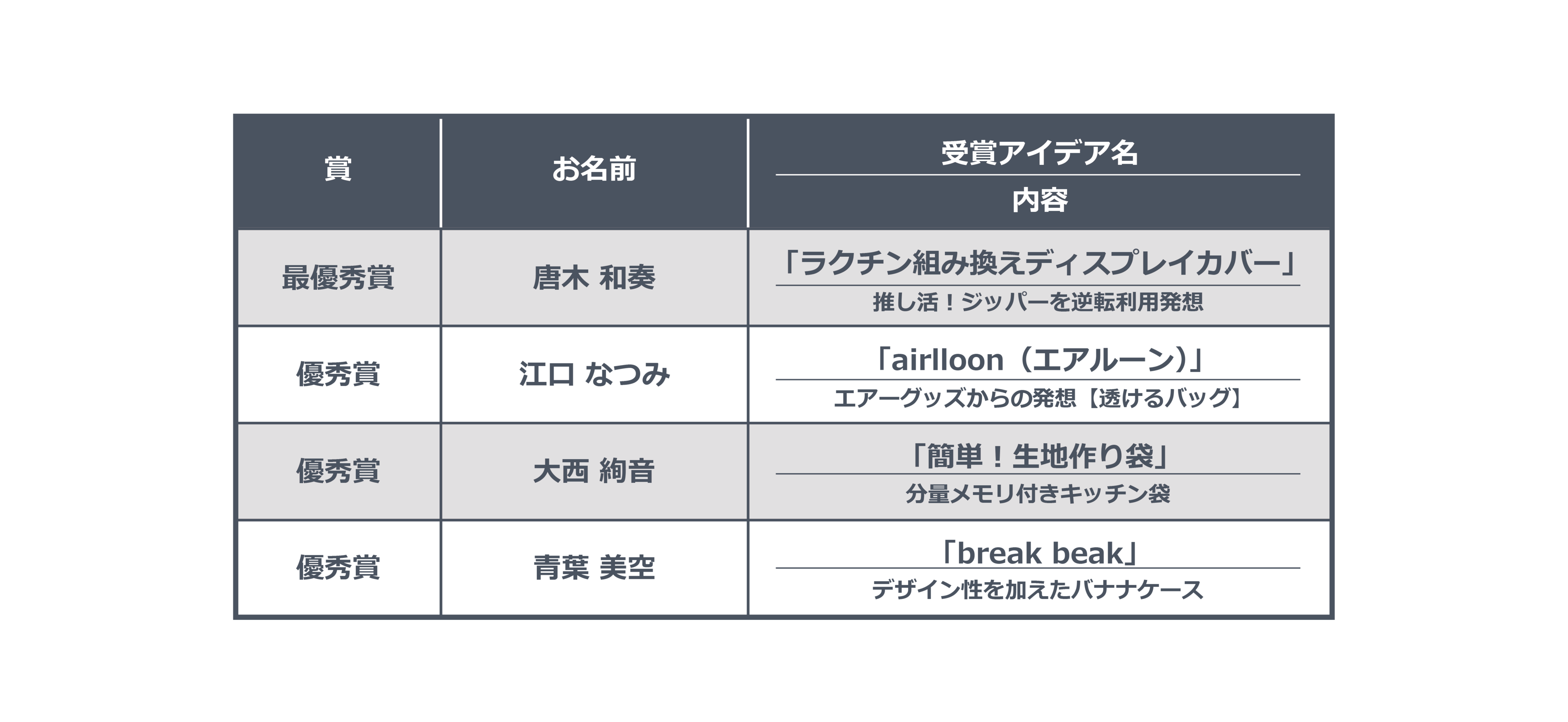学生の皆さまへ、ポリ袋の歴史・種類や製造方法など実際に商品に触れながら学んでいただき、ポリエチレンフィルムで新たな用途開発などを検討してもらいました。学生からは26点ものアイデアを出していただきました。Z世代の若いデザイナーの想いが詰まった商品提案は、柔軟な発想で審査に難航しましたが、最優秀賞1点、優秀賞3点を選考し、12月16日に表彰式を行いました。
